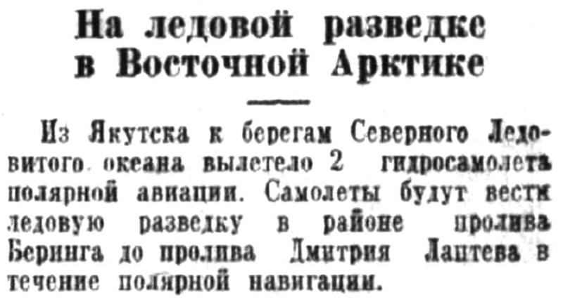 24 мая, в 10 часов утра, Герой Советского Союза т. Водопьянов вылетел на самолете «Н-170» из Москвы в Амдерму. Водопьянов произведет раннюю ледовую преднавигационную разведку в районах Амдерма — мыс Желания — остров Уединения — мыс Челюскин. Обратно самолет полетит по маршруту: мыс Челюскин — острова Известий — остров Белый — Амдерма.