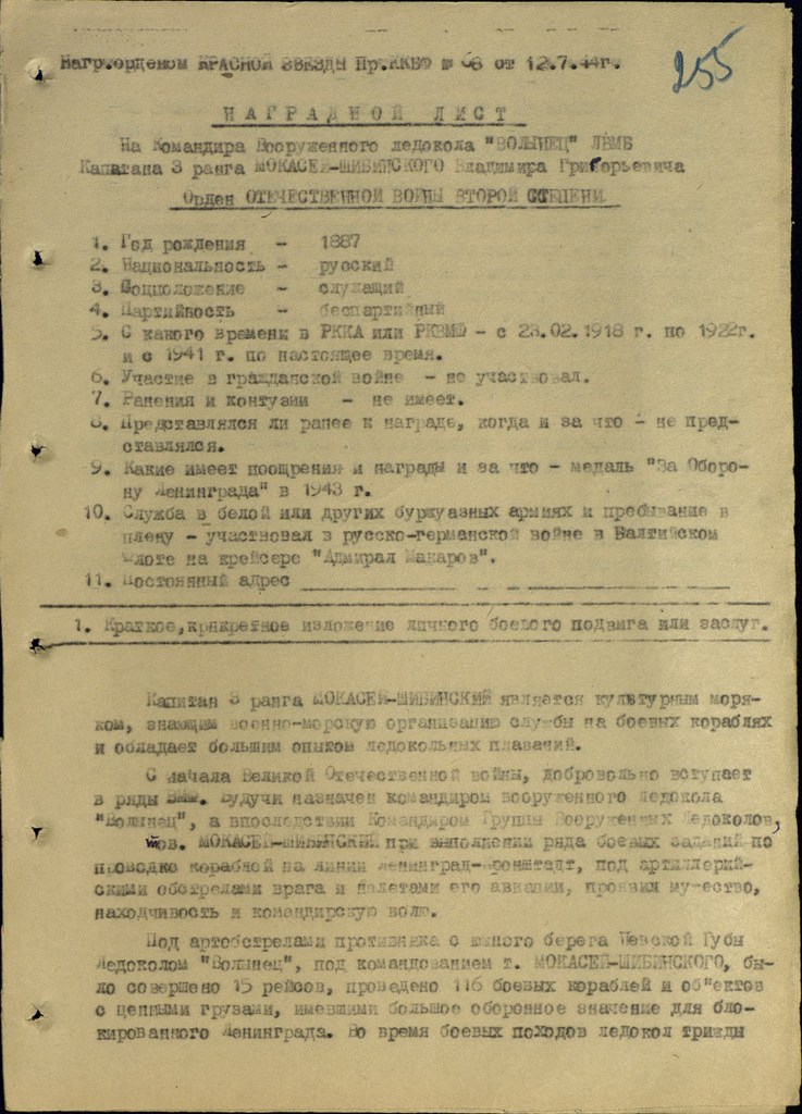 За отвагу и мужество, проявленные в боевых операциях, большую работу по сохранению механизмов кораблей в условиях блокированного Ленинграда - Капитан 3 ранга МОКАСЕЙ-ШИБИНСКИЙ достоин награждения орденом ОТЕЧЕСТВЕННОЙ ВОЙНЫ ВТОРОЙ СТЕПЕНИ.