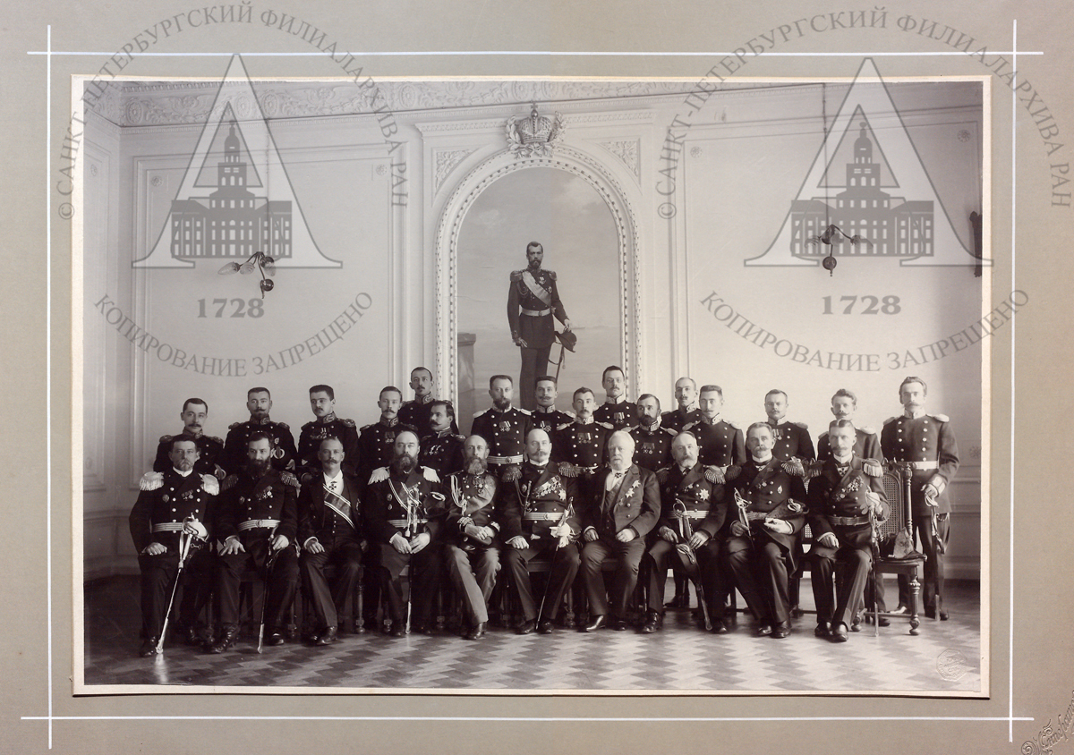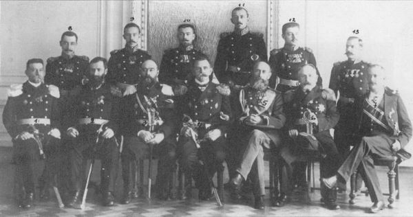 Выпуск слушателей Гидрографического отделения Морской Академии. 1908 г.: 1-7 — преподаватели И. И. Оглоблинский, А. Н. Крылов, А. И. Вилькицкий, ... Шульгин, Н. Я. Цингер, И. Б. Шпиндлер, Б. Б. Голицын; 8-13 — слушатели Б. В. Давыдов,... Емельянов,... Альтфатер,... Макасей-Шибинский, Б. А. Вилькицкий, Богдан Христов Ганчев (болгарин)