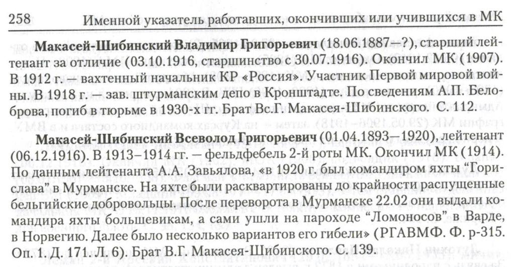Макасей-Шибинский Всеволод Григорьевич (01.04.1893— 1920), лейтенант (06.12.1916). В 1913-1914 гг. — фельдфебель 2-й роты МК. Окончил МК (1914). По данным лейтенанта А.А. Завьялова, «в 1920 г. был командиром яхты “Горислава” в Мурманске. На яхте были расквартированы до крайности распущенные бельгийские добровольцы. После переворота в Мурманске 22.02 они выдали командира яхты большевикам, а сами ушли на пароходе “Ломоносов” в Варде, в Норвегию. Далее было несколько вариантов его гибели» (РГАВМФ. Ф. р-315. Oп. 1. Д. 171. Л. 6). Брат В.Г. Макасея-Шибинского. С. 139.