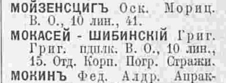 Мокасеи-Шибинские переехали на Б. Пушкарскую, д.3. Генерал-майор стал генерал-лейтенантом. Совместно с ними стала проживать дочь-Кира Григорьевна. Искомая особа - Владимир Григорьевич, так в справочнике и не проявился - служба, война, революция, наверное поэтому.
