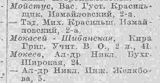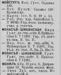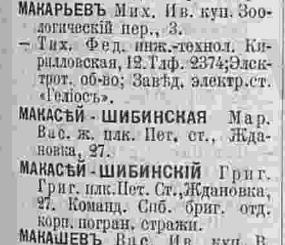 В книге 1923 года вновь появляется Кира Григорьевна М...-Шибинская, причем с двумя вариантами написания фамилии - Макасей и Мокасей, по адресу: В.О. 2-я линия, кв.41.