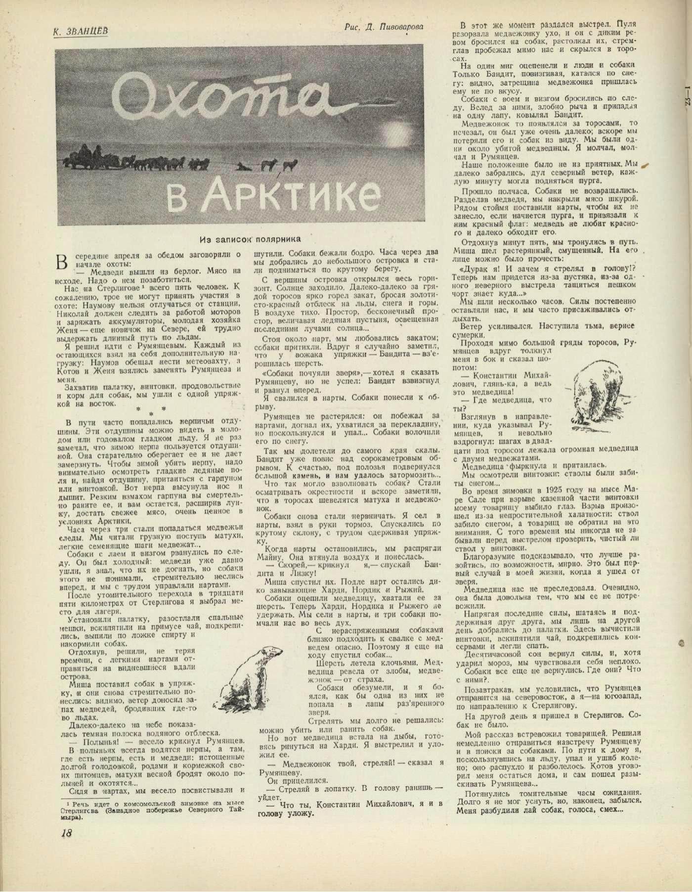 Я ударник, учусь в нашем красинском техникуме и одновременно работаю в парашютном кружке. Мечтой моей было прыгнуть в Аркти¬ке, Сегодня эта мечта сбылась. Было труднее, чем я думал. Арктика — своеобразная «фабрика погоды»: солнце быстро закрывается туманом, дождь мешается со снегом, скорость ветра изменчива. На высоте 800 метров уже сильный холод, и главное, не знаешь, куда приземлишься. Вода полярного моря не слишком приятна. Торосистый лед еще опаснее. Остается берег, покрытый непроходимыми болотами, высокими кочками и острыми камнями.