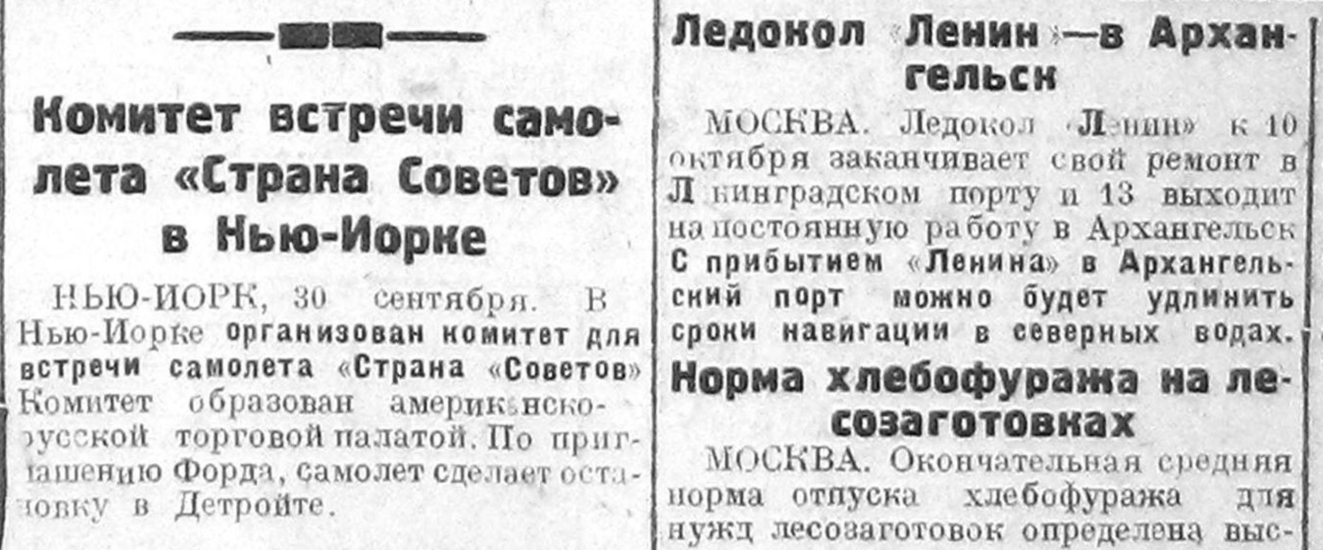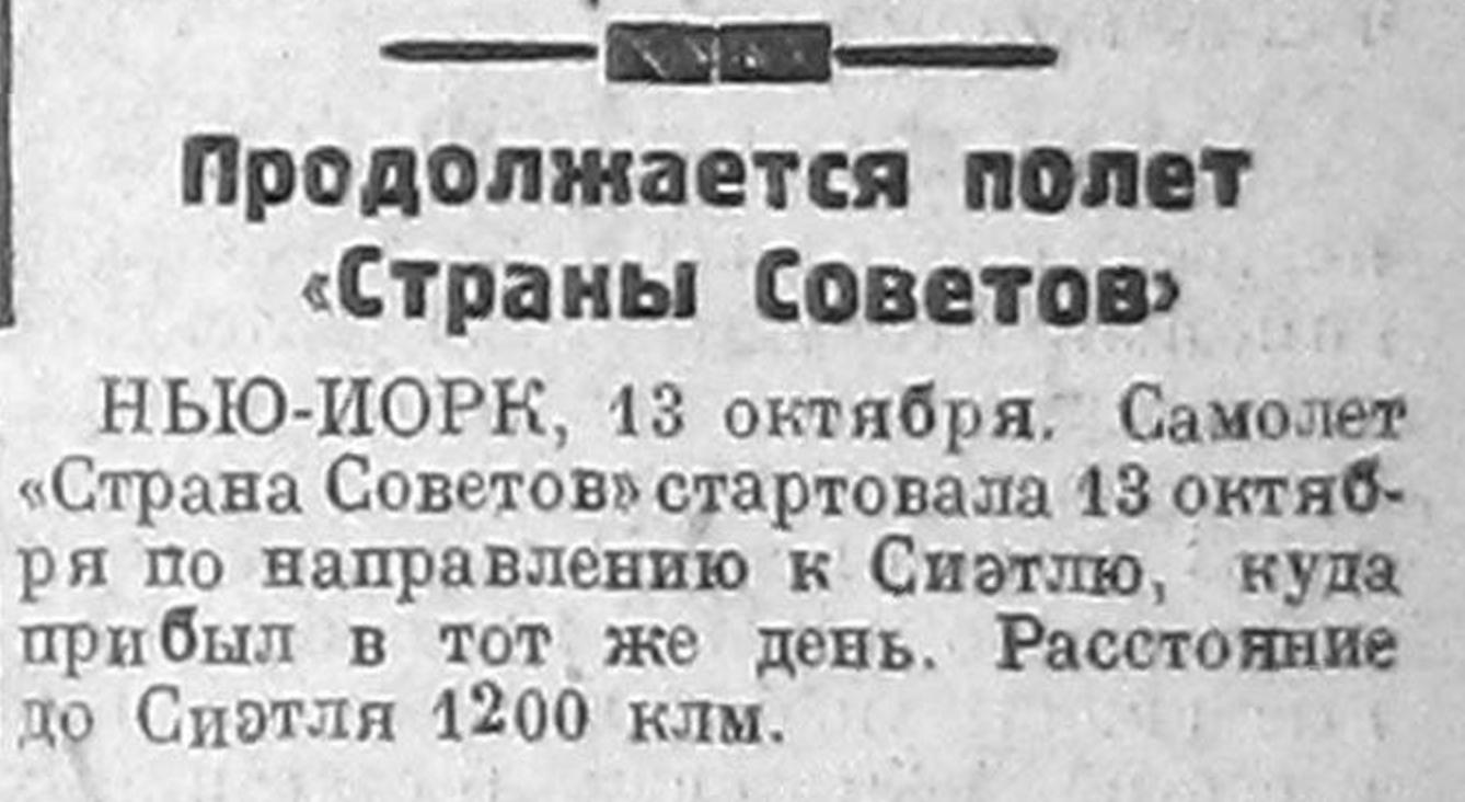 НЬЮ-ЙОРК, 13 октября. Самолет «Страна Советов» стартовала 13 октября по направлению к Сиэтлю, куда прибыл в тот же день.