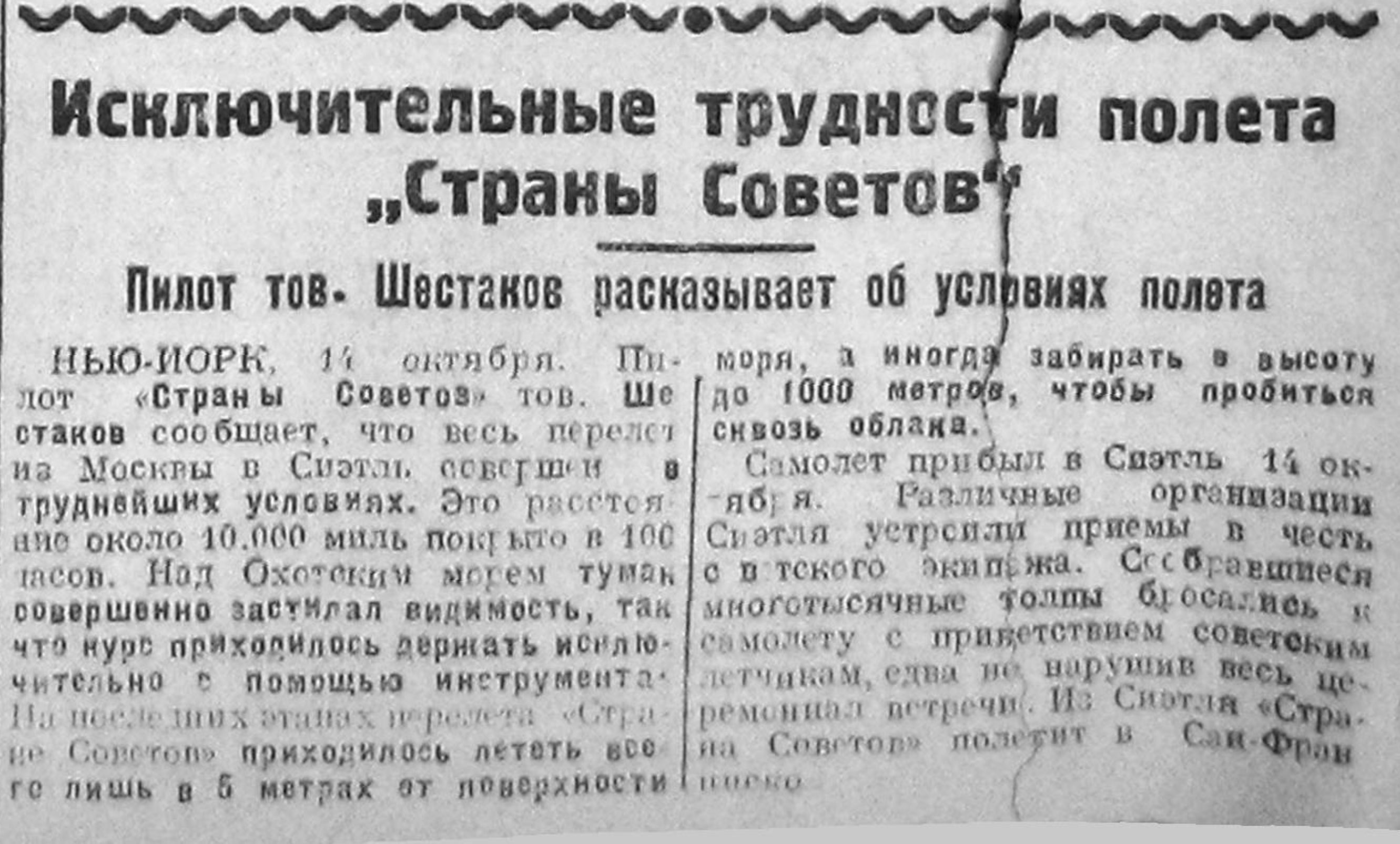 НЬЮ-ЙОРК, 14. октября. Пилот "Страны Советов" тов. Шестаков сообщает, что весь перелет из Москвы в Сиэтль совершен в труднейших условиях. Это расстояние около 10.000 миль покрыто в 100 часов. Над Охотским морем туман совершенно застилал видимость, так что курс приходилось держать исключительно с помощью инструмента.