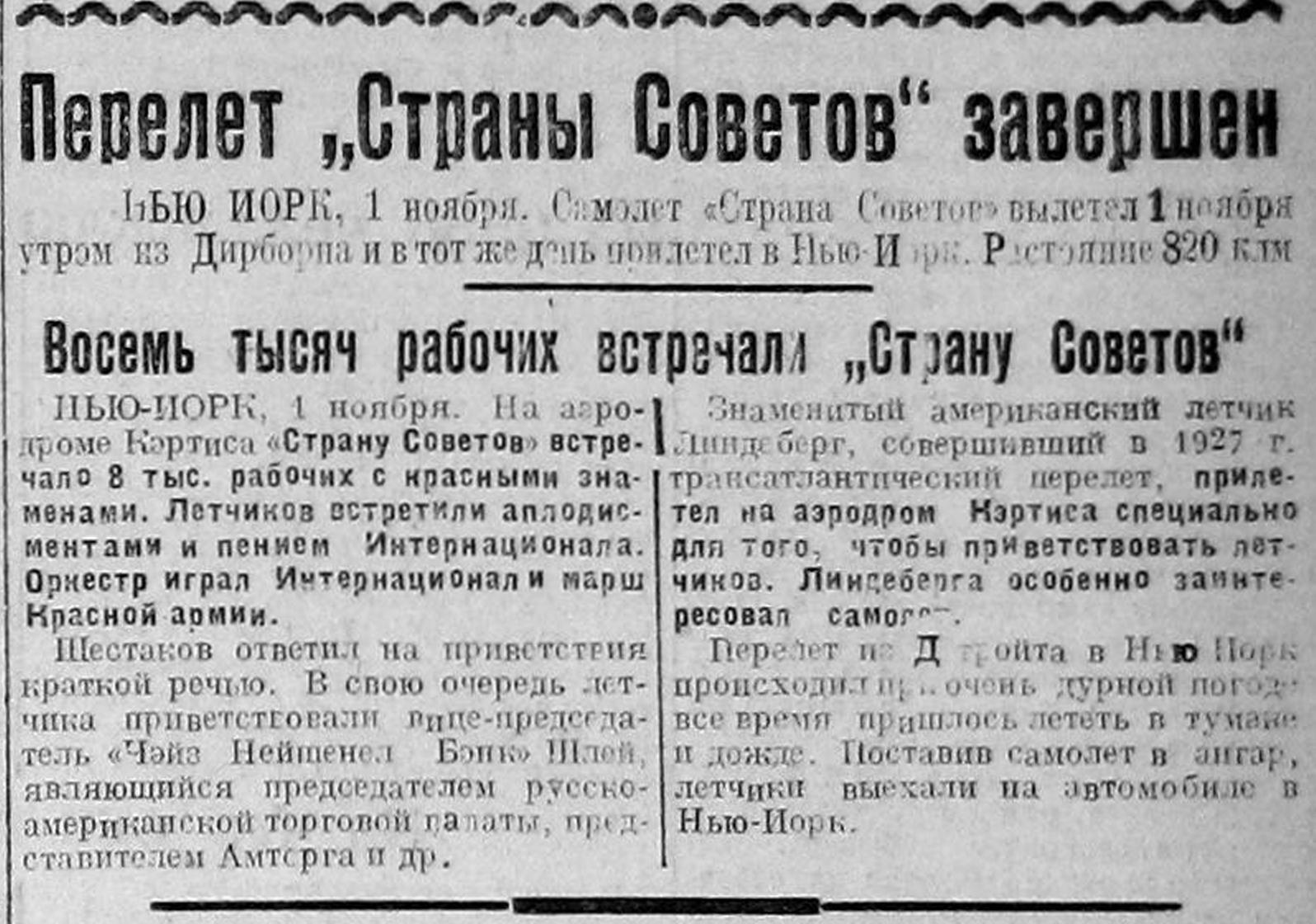 НЬЮ-ЙОРК. 1 ноября. Самолет "Страна Советов" вылетел 1 ноября утром из Дирборна и в тот же день прилетел в Нью-Йорк. Расстояние 820 клм.