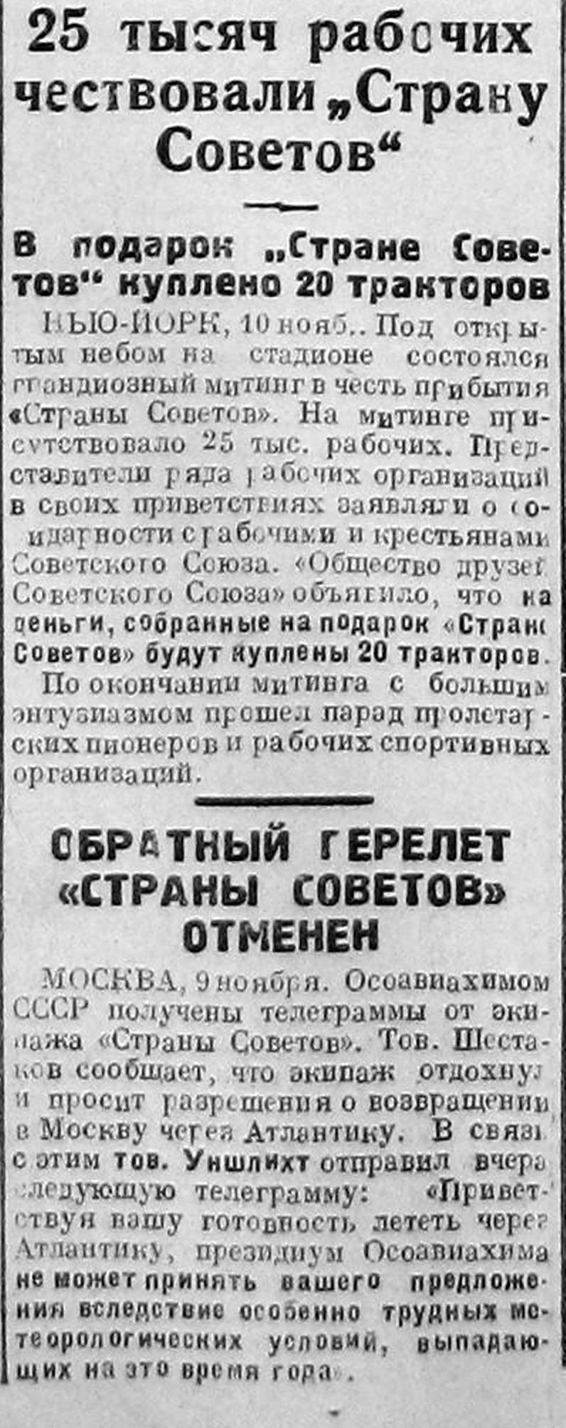 НЬЮ-ЙОРК, 1 ноября. На аэродроме Картиса "Страну Советов" встречало 8 тыс. рабочих с красными знаменами. Летчиков встретили аплодисментами и пением Интернационала. Оркестр играл Итернационал и марш Красной армии.