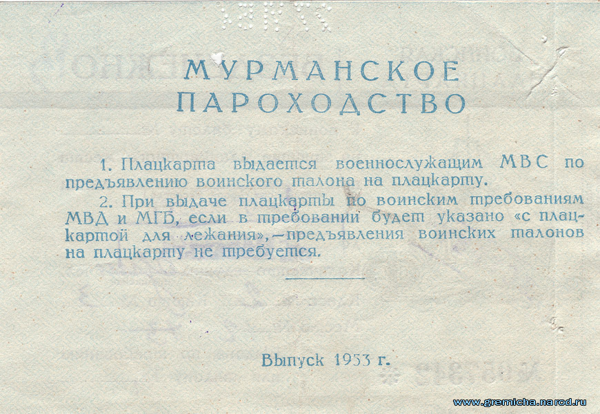 Билет на пароход "Ястреб" от 27.06.1954 года.