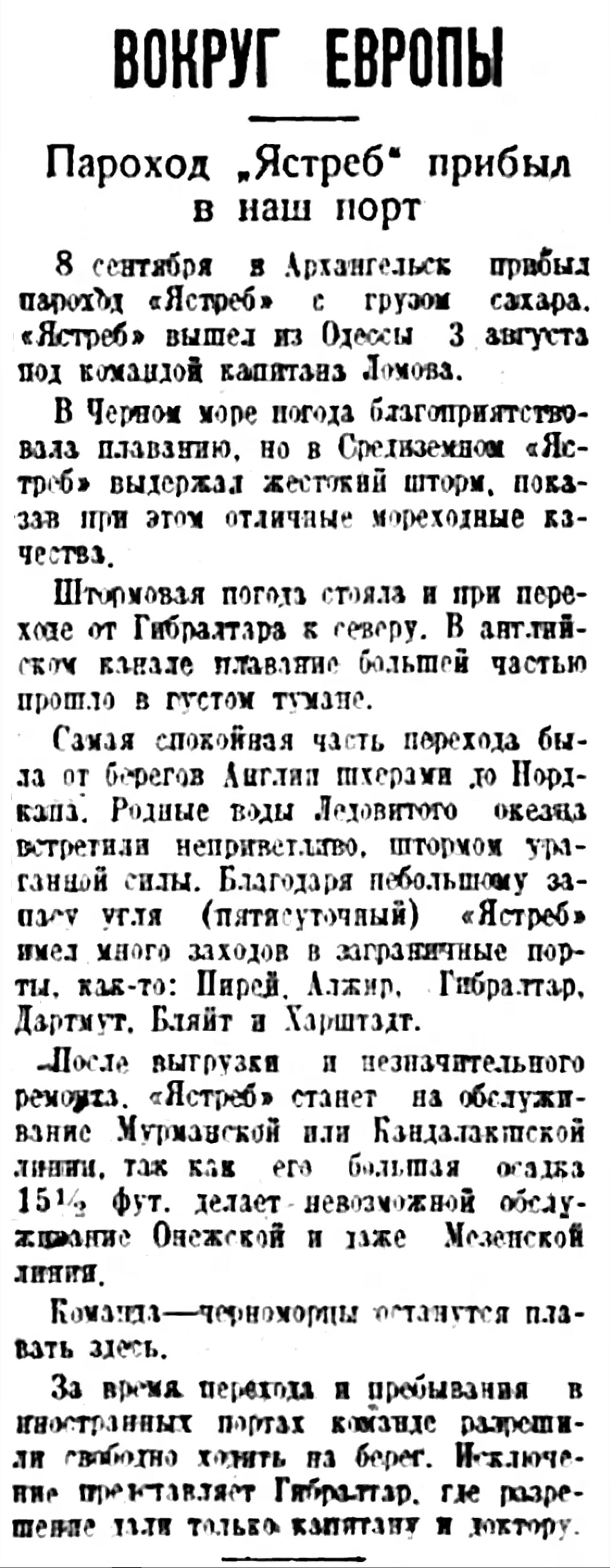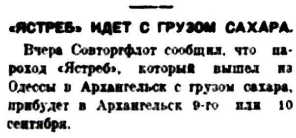 Вчера Совторгфлот сообщил, что пароход «Ястреб», который вышел из Одессы в Архангельск с грузом сахара, прибудет в Архангельск 9-го или 10 сентября.