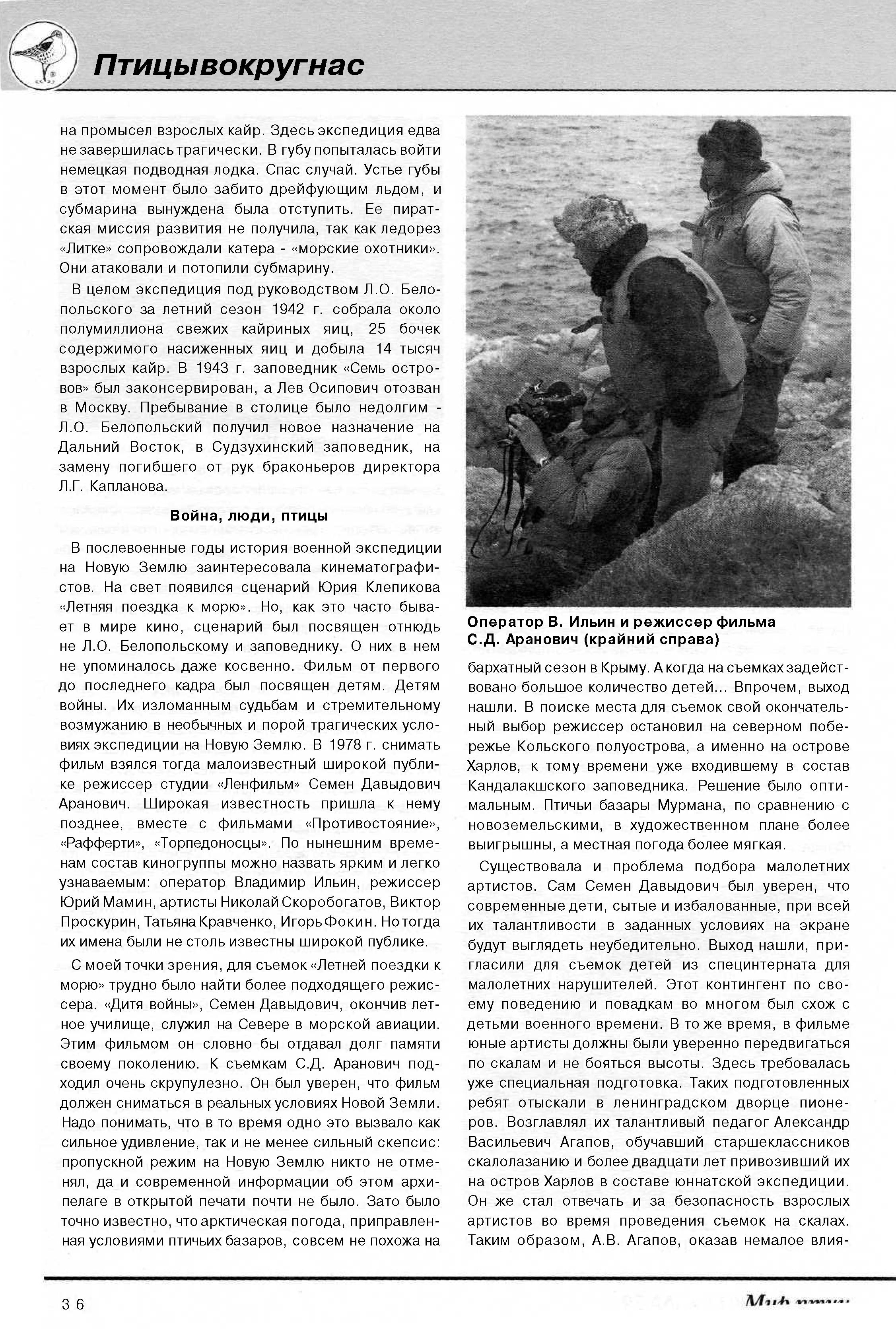 Война, люди, птицыВ послевоенные годы история военной экспедиции на Новую Землю заинтересовала кинематографистов. На свет появился сценарий Юрия Клепикова «Летняя поездка к морю». Но, как это часто бывает в мире кино, сценарий был посвящен отнюдь не Л.О. Белопольскому и заповеднику. О них в нем не упоминалось даже косвенно. Фильм от первого до последнего кадра был посвящен детям. Детям войны. Их изломанным судьбам и стремительному возмужанию в необычных и порой трагических условиях экспедиции на Новую Землю. В 1978 г. снимать фильм взялся тогда малоизвестный широкой публике режиссер студии «Ленфильм» Семен Давыдович Аранович. Широкая известность пришла к нему позднее, вместе с фильмами «Противостояние», «Рафферти», «Торпедоносцы». По нынешним временам состав киногруппы можно назвать ярким и легко узнаваемым: оператор Владимир Ильин, режиссер Юрий Мамин, артисты Николай Скоробогатов, Виктор Проскурин, Татьяна Кравченко, Игорь Фокин. Но тогда их имена были не столь известны широкой публике.