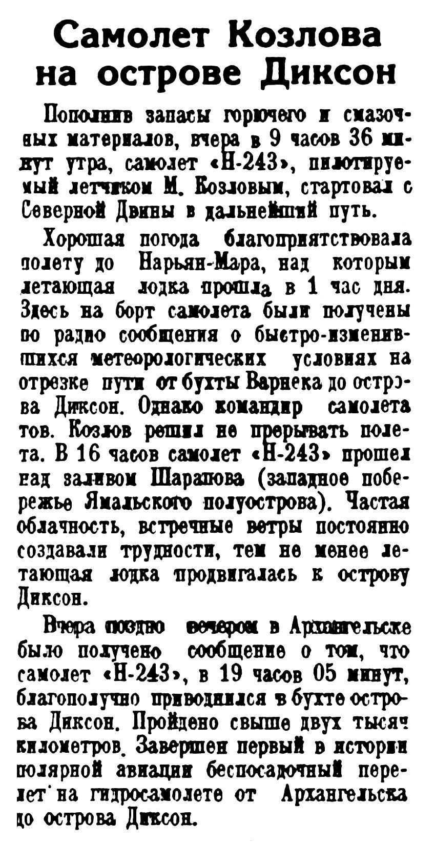 Вчера поздно вечером в Архангельске было получено сообщение о том, что самолет «Н-243», в 19 часов 05 минут, благополучно приводнился в бухте острова Диксон. Пройдено свыше двух тысяч километров. Завершен первый в истории полярной авиации беспосадочный перелет на гидросамолете от Архангельска до острова Диксон.