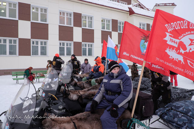 После митинга и официальных речей, четыре боевых машины, очищенные священным дымом ненецкого обряда, под «Марш славянки» пересекли улицу Первомайскую и спустились на замёрзшую Печору. Практически никем не замеченный, под шумок и дымок, за ними отправился ещё один снегоход. В команде «вольнонаёмных» – депутат Архангельского областного Собрания от НАО Матвей Чупров, в качестве информационного сопровождения – корреспондент ВНАО. В походном порядке пять снегоходов двинулись к первой точке маршрута – селу Тельвиска, через которую в годы войны проходил путь оленетранспортных эшелонов.
