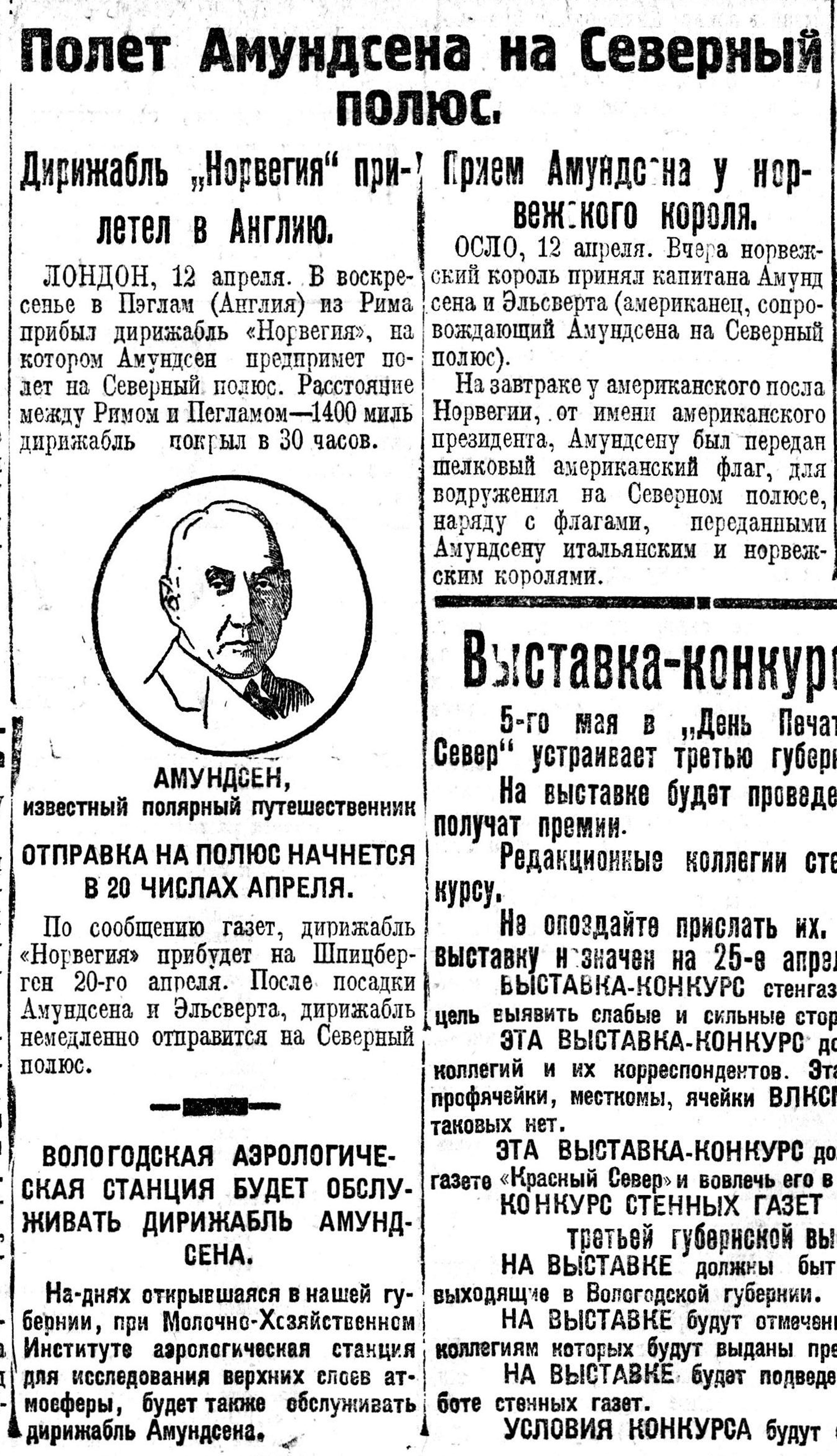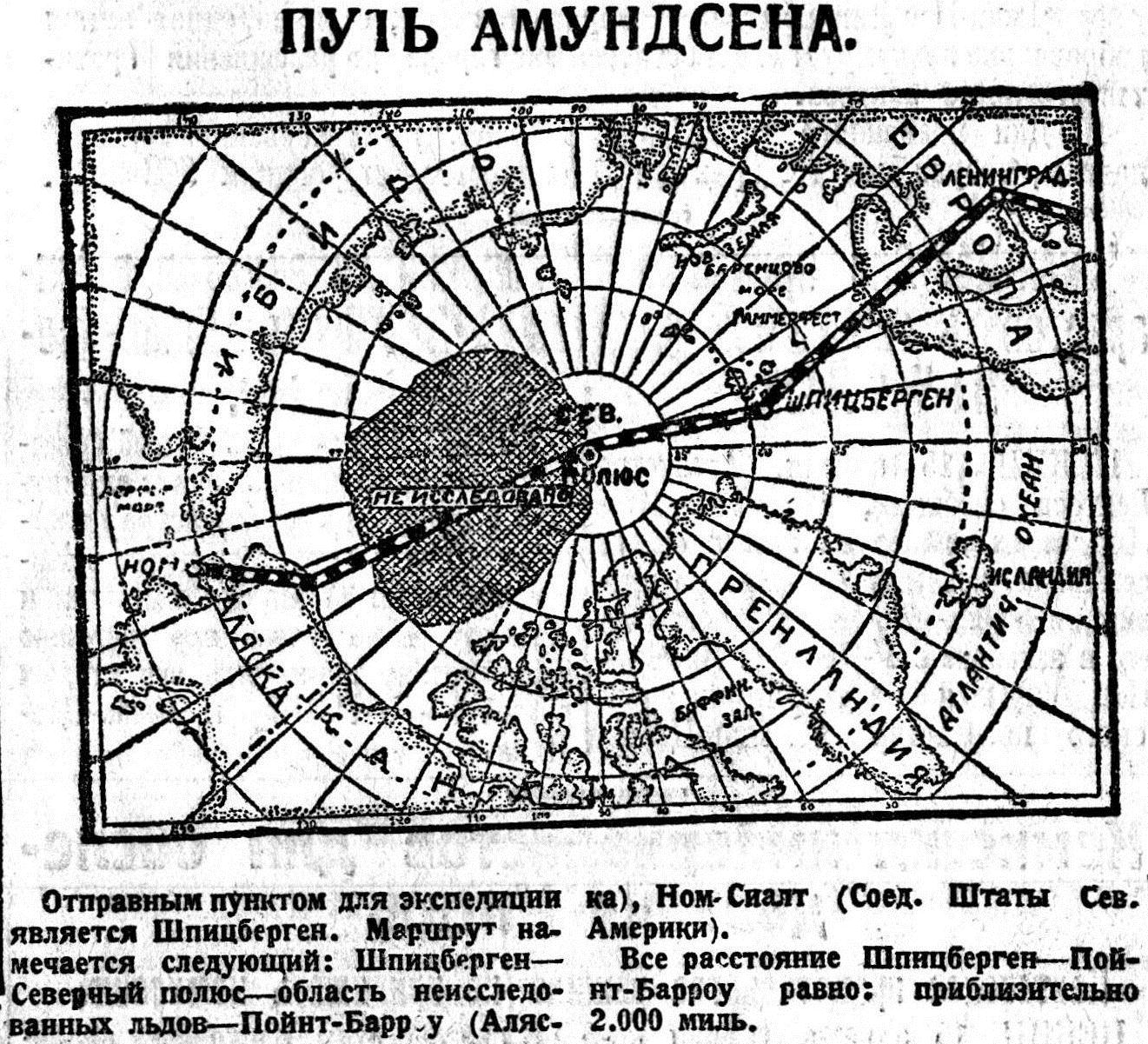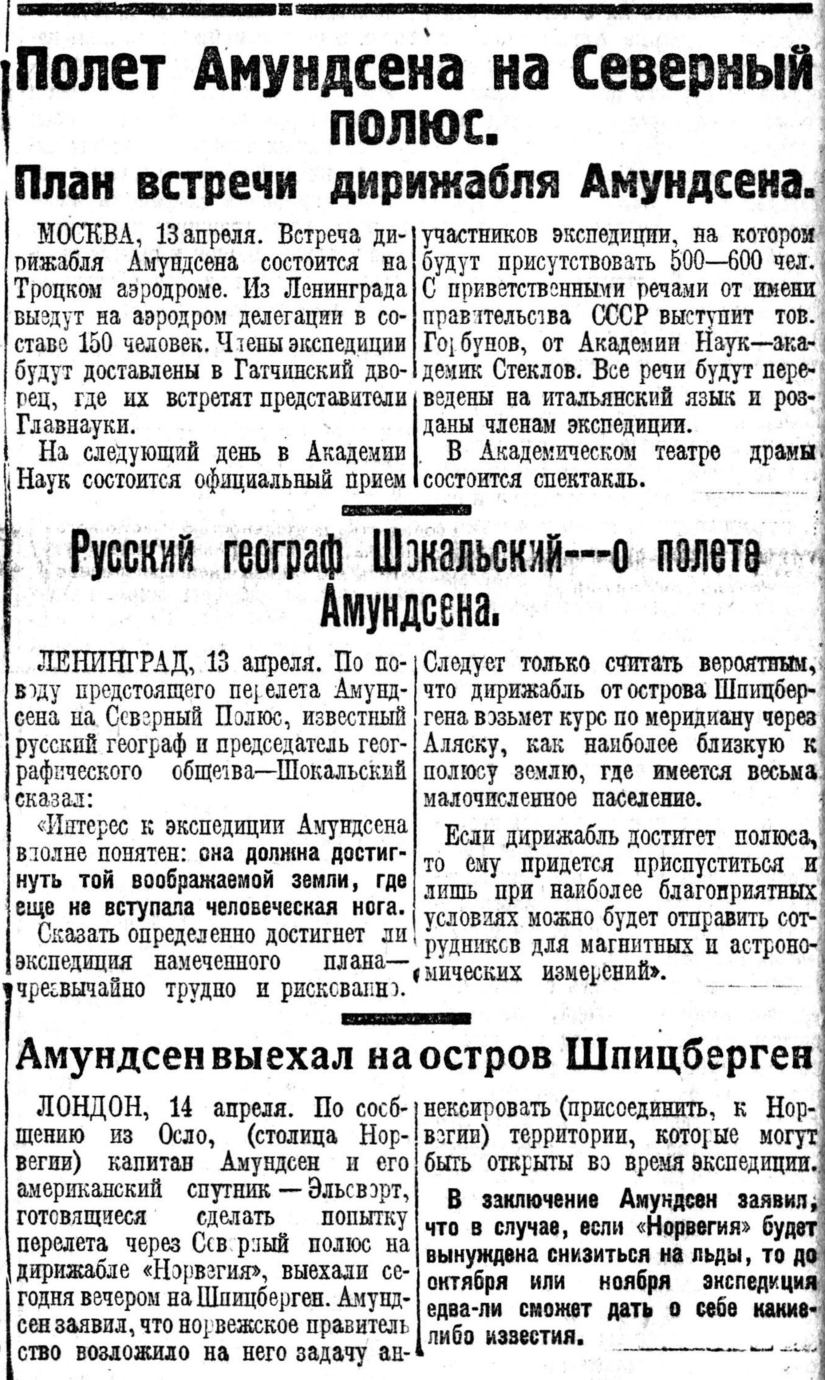 Полет Амундсена на Северный полюс вызвал огромный интерес в научных кругах Ленинграда. Поднят вопрос о создании комитета коллективной помощи Амундсену. Геофизическая обсерватория приспособляет свой аппарат для содействия полету; полярная комиссия Академии Наук представит свои соображения о состоянии льдов и атмосферных условий в Полярной области. Институт по изучению Севера, в свою очередь, дает заключение о наиболее благоприятных условиях полета и разрабатывает схематическую карту Полярной области.