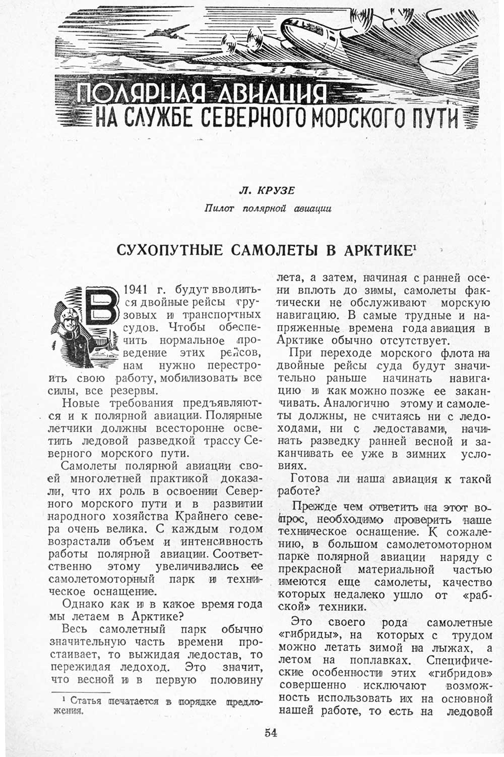 По своему характеру предстоящие полеты на летающей лодке значительно отличаются от тех глубоких рейсов в высокие широты, которые были проведены мною весной этого года. Тогда пришлось в основном заниматься научной работой по составлению ледовых прогнозов, по изучению неисследованных районов Восточной Арктики Сейчас же предстоит непосредственно разыскивать трассы для морских кораблей, направляющихся по Северному морскому пути с запада на восток и с востока на запад. Большой радиус действия, которым обладает наша лодка, позволяет в течение одного рейса определить состояние льдов на огромном пространстве, результаты ледовых авиаразведок помогут капитанам судов ориентироваться на пути их следования.