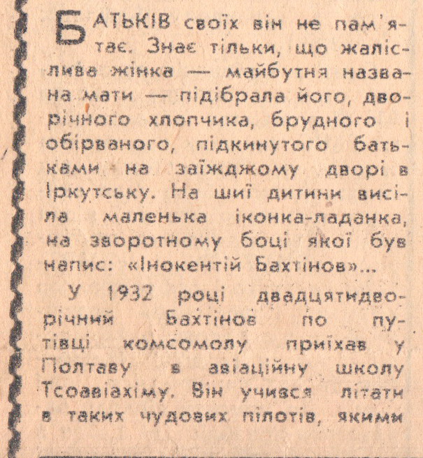 В это время по заданию тов. Разумова пилот аэроклуба т. Г. И. Бахтинов в колхозе "Октябрьские дни" укладывал в самолет тяжело больного ударника-колхозника т. Жукова для отправки в Иркутск на операцию (см. ВСП от 2 декабря). Узнав о новом несчастье, т. Бахтинов дал слово председателю райисполкома т. Зенченко вернуться за больной.