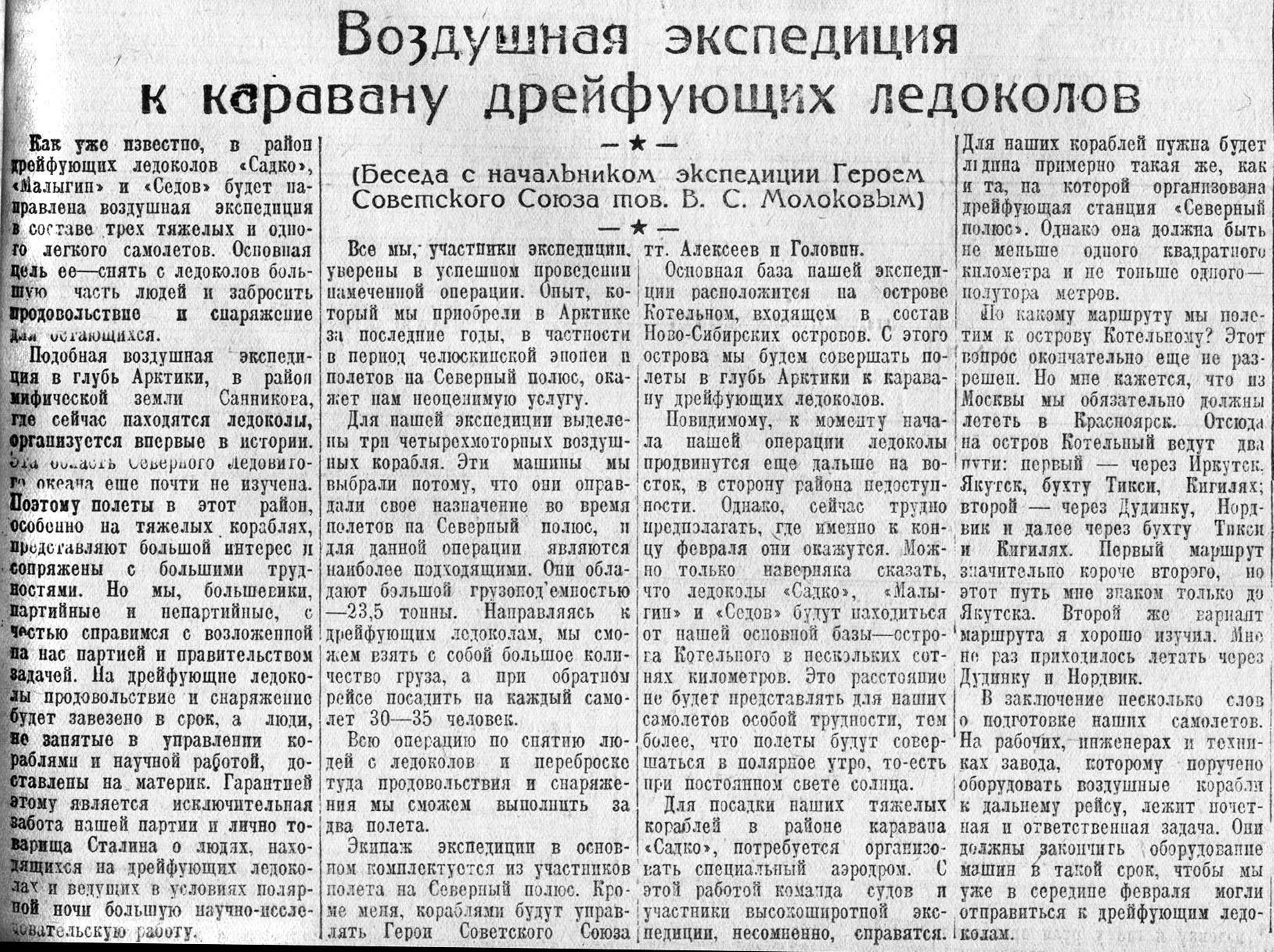 Главной Управление Северного морского пути решило отправить в конце февраля в район дрейфа ледоколов «Садко», «Седов» и «Малыгин» специальную воздушную экспедицию под руководством Героя Советского Союза Молокова. Ей будет поручено снять с дрейфующих судов большую часть находящихся там людей и доставить на эти корабли различное снаряжение, радиооборудование, почту, газеты и продукты.
