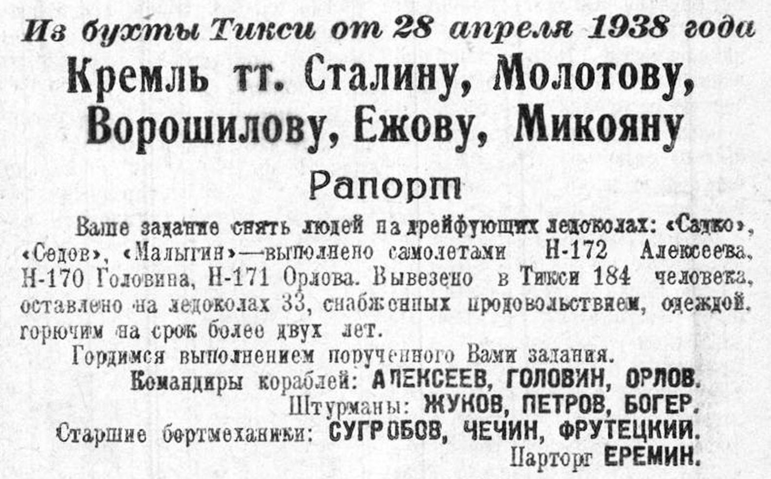 28 апреля экспедиция Героя Советского Союза тов. А. Д. Алексеева рапортовала партии и правительству о выполнении порученного ей задания по снятию людей с дрейфующих ледоколов "Садко", "Седов" и "Малыгин".