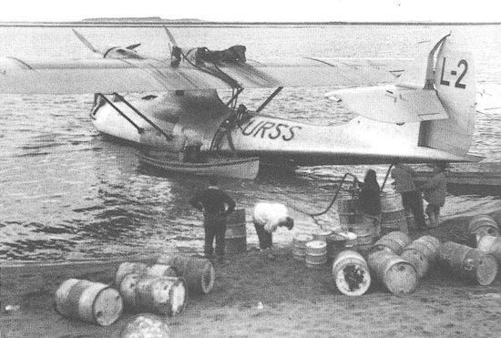 "... Кроме того, в поисках экипажа С. Леваневского принял участие известный полярный исследователь Губерт Вилкинс на большом гидроплане фирмы "Консолидейтед", приобретенном в америке Главным управлением Северного морского пути по поручению советского правительства. Гидросамолет типа летающей лодки представлял собою двухмоторный моноплан с радиусом действия в 4000 миль; он оказался вполне подготовленным для экспедиционных работ и дальних полетов; после приобретения он получил опозновательые знаки "СССР Л-2".
