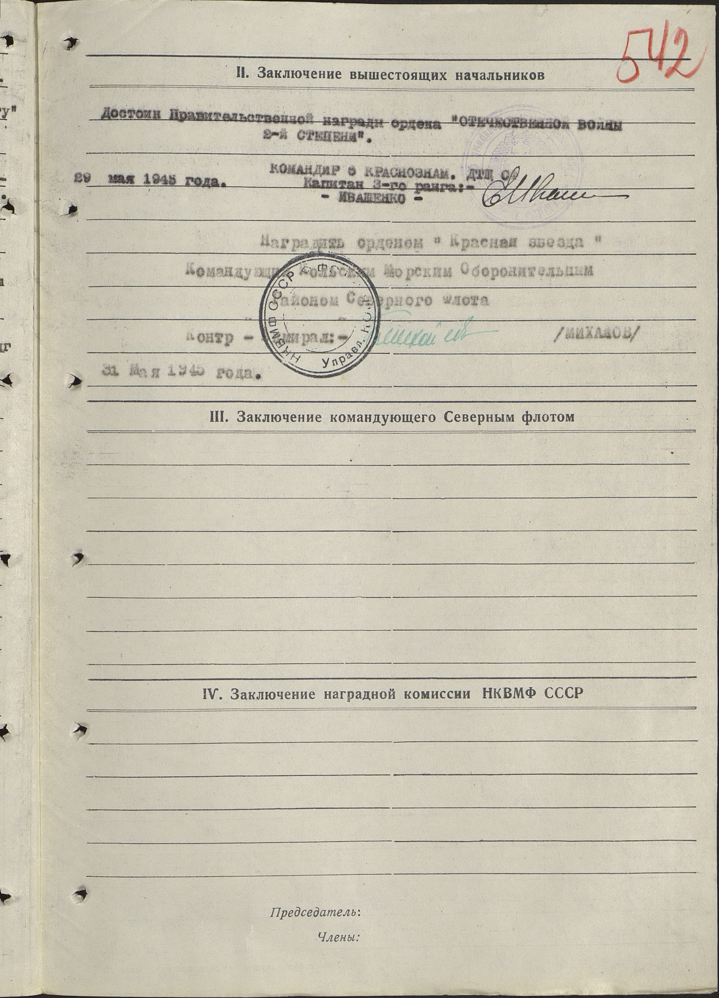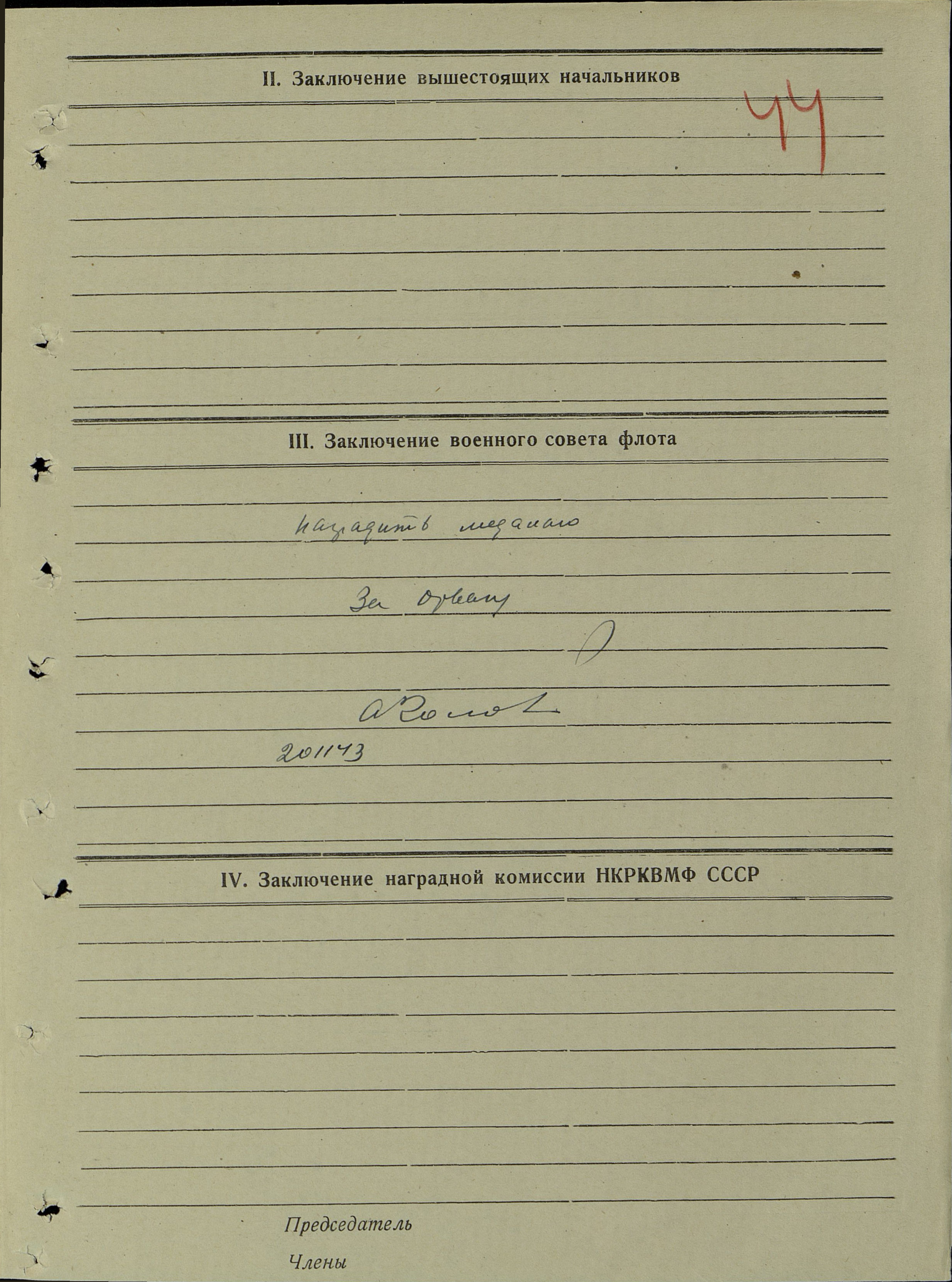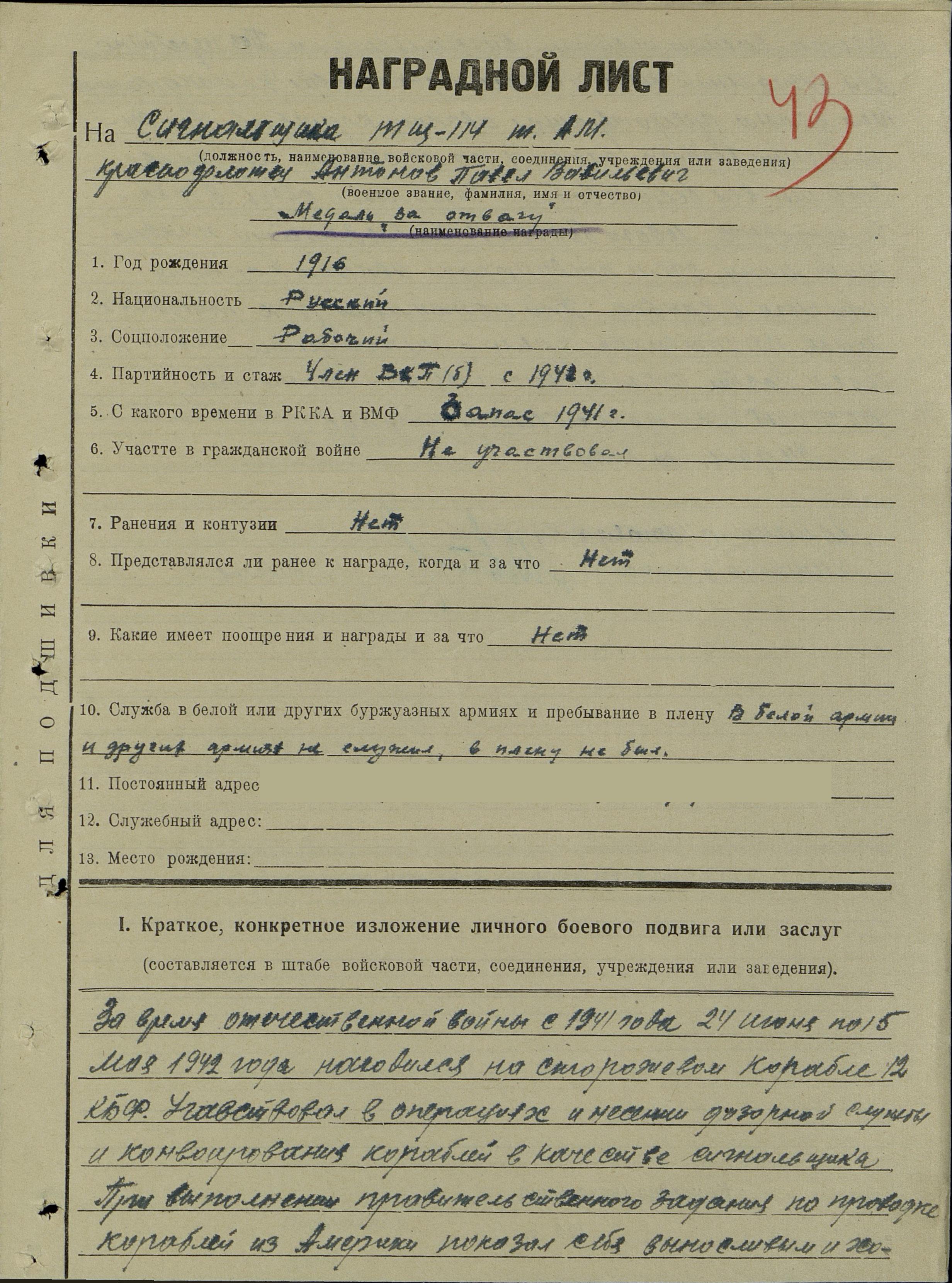 г. Ленинград; дополнительная информация – с 24.06.1941 г. по 15.06.1942 г. находился на сторожевом корабле СКР-12 ОСТ (?) КБФ, участник выполнения правительственного задания по приемке и доставке ТЩ-114 из США в СССР, участвовал в потоплении двух ПЛ противника.
