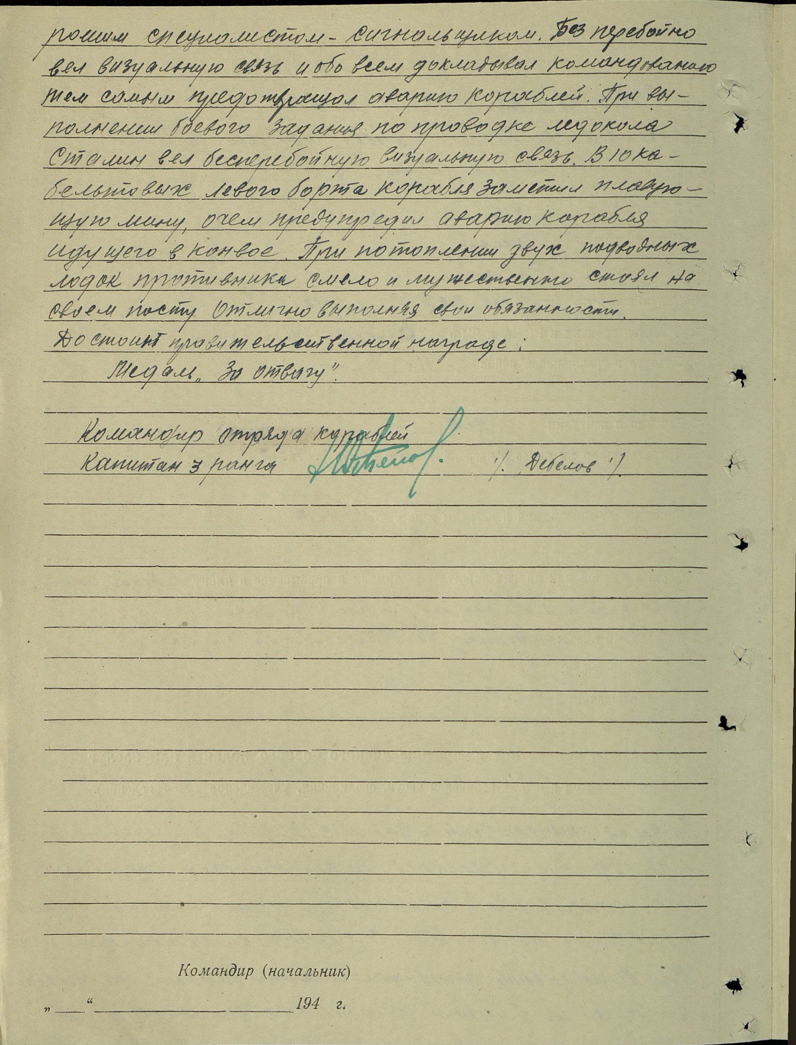 За время Отечественной войны, с 24 июня 1941 г. по 15 мая 1942 г. находился на сторожевом корабле 12 (?) КБФ. Участвовал в операциях и несении дозорной службы, и конвоирования кораблей в качестве сигнальщика. При выполнении правительственного задания по проводке кораблей из Америки показал себя выносливым и хорошим специалистом-сигнальщиком. Бесперебойно вел визуальную связь и обо всем докладывал командованию, тем самым предотвращал аварию кораблей. При выполнении боевого задания по приводке ледокола «И. Сталин» вел бесперебойную визуальную связь. В 10 кабельтовых от левого борта корабля заметил плавающую мину, чем предупредил аварию корабля идущего в конвое. При потоплении двух подводных лодок противника смело и мужественные стоял на своем посту, отлично выполняя свои обязанности.