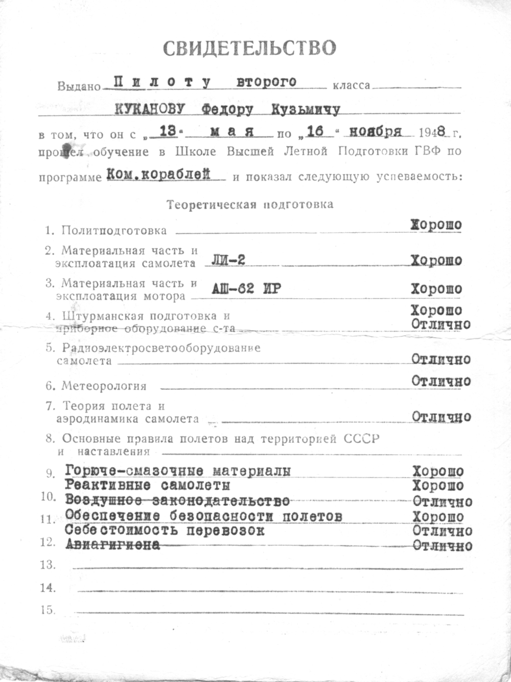 1. Пилота 2 класса Чукотской АГ Куканова Ф.К. за нарушения правил эксплуатации материальной части и проявленную недисциплинированность, – снять с лётной работы. Аварию самолёта занести в личное дело пилота Куканова;