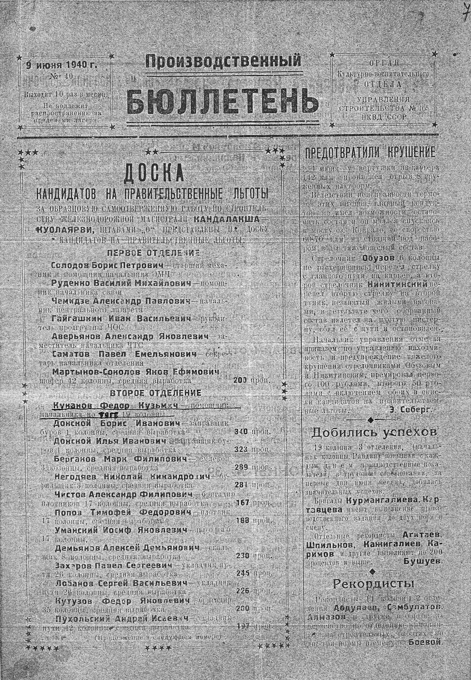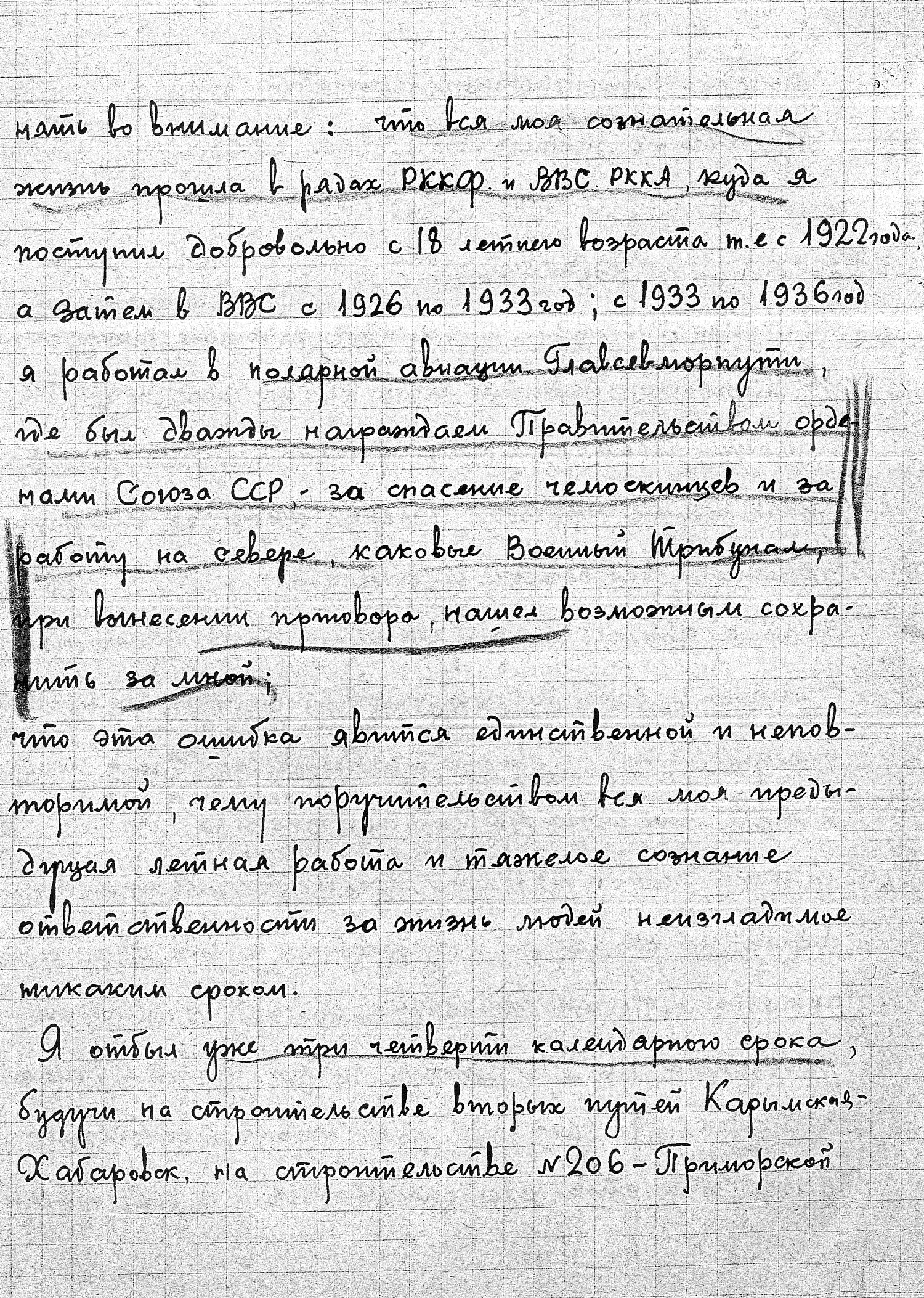 "Я отбыл уже три четверти календарного срока, будучи на строительстве вторых путей Карымская–Хабаровск, на строительстве № 206 – Приморской железной дороги, и на строительстве № 105 Кандалакша–Куолаярви"