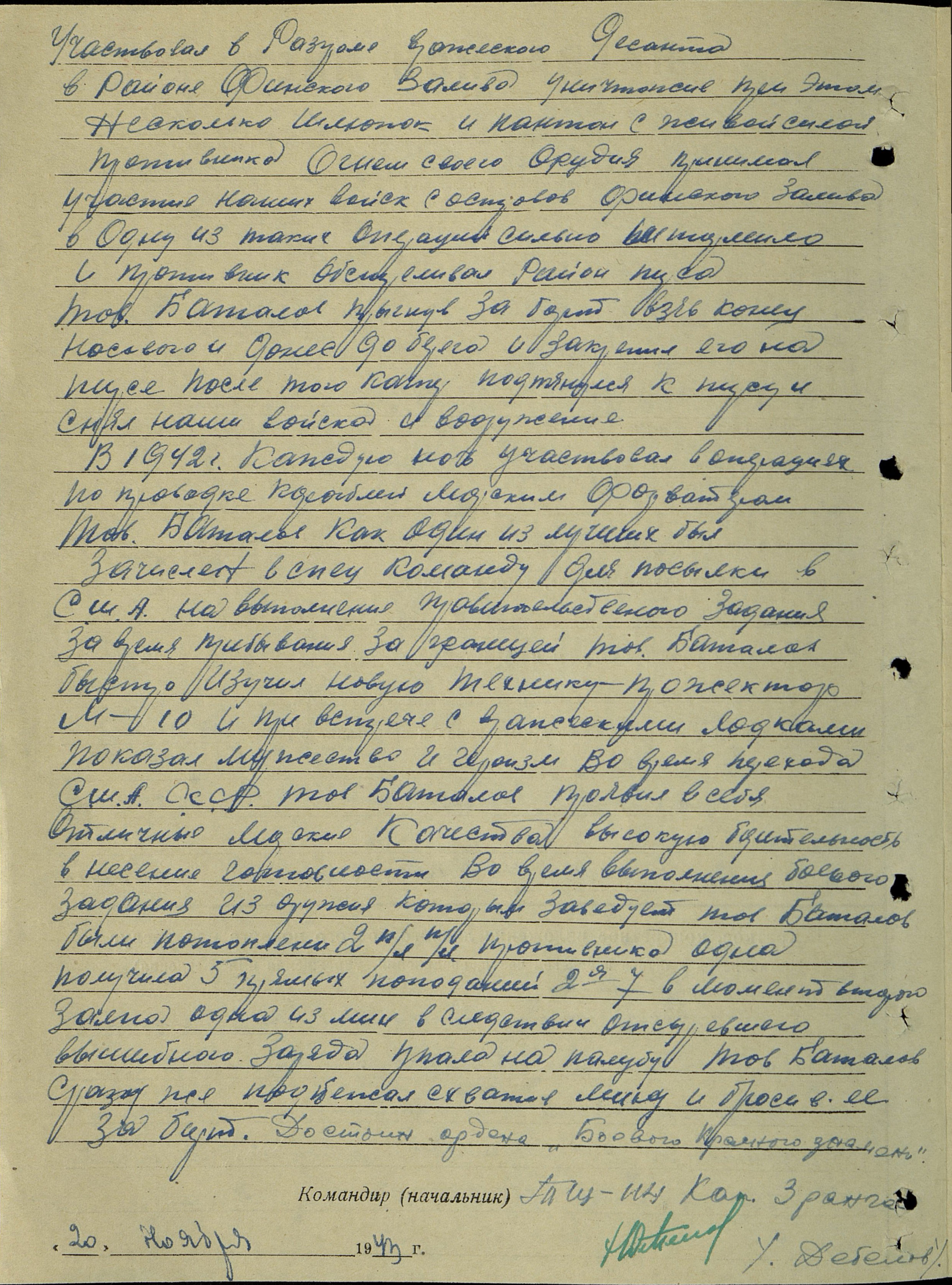 Тов. Баталов как один из лучших был зачислен в спецкоманду для отправки в США на выполнение правительственного задания. За время пребывания за границей тов. Баталов быстро изучил новую технику - прожектор М-10, и при встрече с вражескими [подводными] лодками показал мужество и героизм. Во время перехода США–СССР тов. Баталов проявил в себе отличные морские качества, высокую бдительность в несение готовности (?). Во время выполнения боевого задания из оружия которым, заведует тов. Баталов, были потоплены две ПЛ противника, одна получила 5 прямых попаданий, вторая – 7. В момент высокого залпа одна из мин вследствие отсыревшего вышибного заряда упала на палубу. Тов. Баталов сразу подбежал, схватил мину и бросив ее за борт. Через 4–5 секунд мина взорвалась в воде за бортом.
