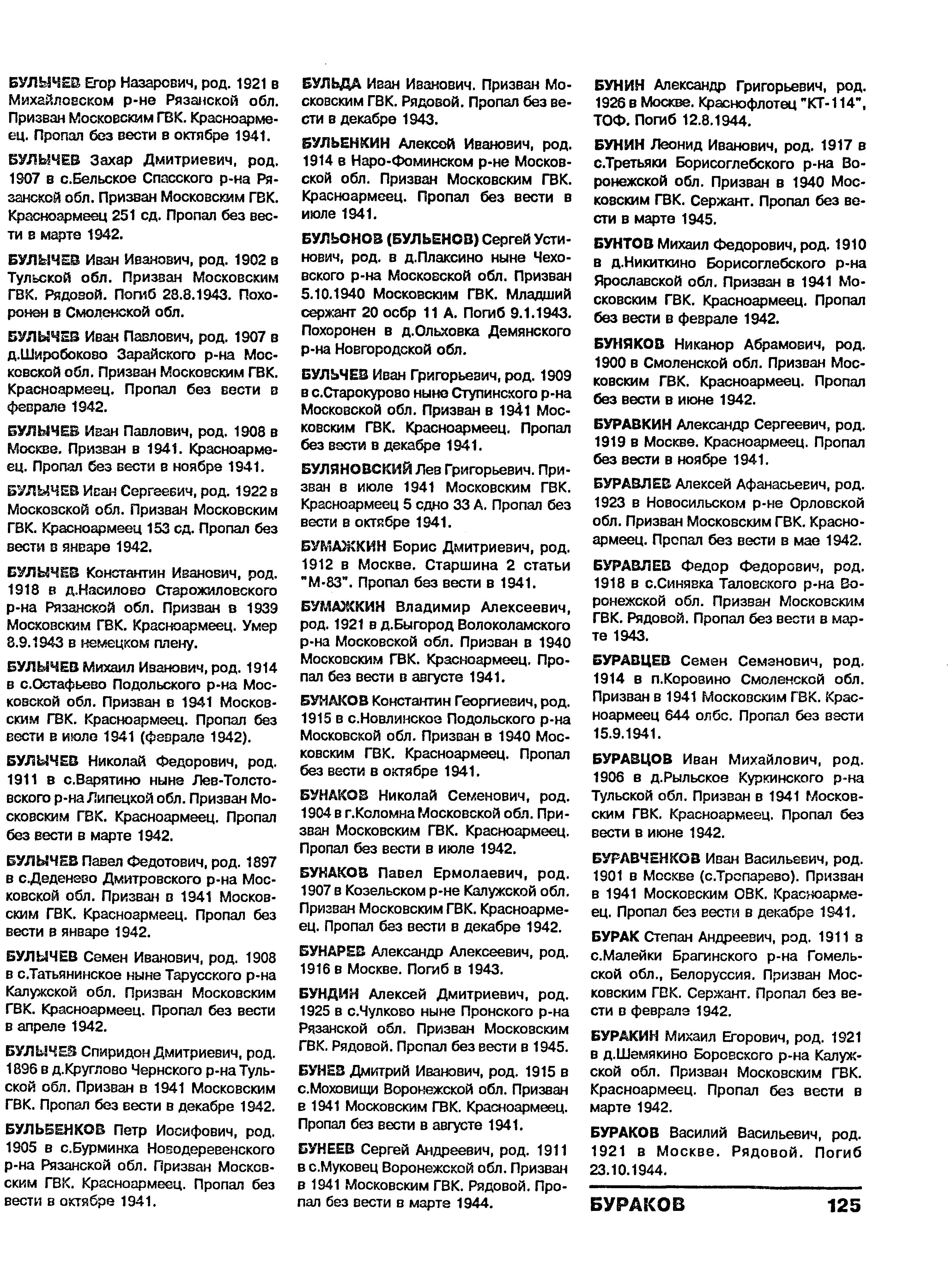 Бунин Александр Григорьевич, воинское звание – краснофлотец (юнга); должность (специальность), часть – моторист 3 кл. (ученик моториста), тральщик ТЩ-114 6 ДТЩ Бригада траления ОВР ГБ СФ; год рождения – 1924 (1926); место рождения – г. Москва; партийность – член ВЛКСМ с 1943 г.; социальное положение – учащийся (рабочий); национальность – русский; срок срочной службы – 22.08.1942 (1944) г.; каким РВК призван – Фрунзенским РВК г. Москва; награды – медаль «За отвагу»; по какой причине, где и когда выбыл – погиб в море при выполнении боевого задания 12.08.1944 г.; семейное положение – холост; родственники – родных нет (родные умерли); дополнительная информация – имел благодарность от командующего БВФ, участник уничтожения двух немецких ПЛ, пытавшихся торпедировать ледокол «И. Сталин».