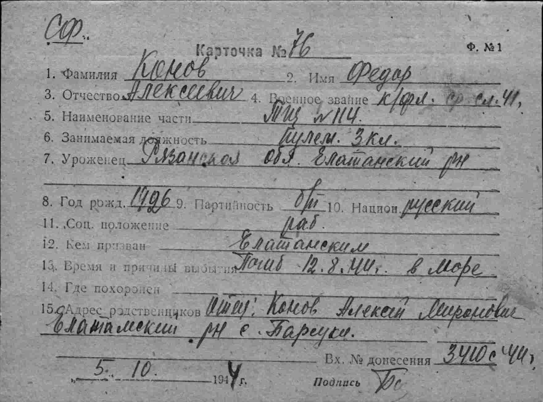 281. Конов (Конев) Федор Алексеевич, воинское звание – краснофлотец; должность (специальность), часть – пулеметчик 3 кл. (комендор), тральщик ТЩ-114 6 ДТЩ Бригада траления ОВР ГБ СФ (п/п 36009); год рождения – 1920 (1926); место рождения – Рязанская обл., Елатомский р-н; партийность – кандидат в члены ВКП(б) с 1942 г. (б/п); социальное положение – колхозник (рабочий); национальность – русский; срок срочной службы – 1940 (1941) г.; каким РВК призван – Елатомским РВК; награды – орден Красной Звезды; по какой причине, где и когда выбыл – погиб в море при выполнении боевого задания 12.08.1944 г.; семейное положение – холост; родственники (ФИО, адрес) – отец, Конов Алексей Миронович, Елатомский (Елатанский) р-н, с. Барсуки; дополнительная информация – имел слепое осколочное ранение в левую ягодицу, участвовал в обороне острова Кронштадт в роте пулеметчиков по ликвидации вражеских десантов, потом списан на оборону г. Ленинграда, был списан в спецкоманду для выполнения правительственного задания по приемке и доставке кораблей из США в СССР.