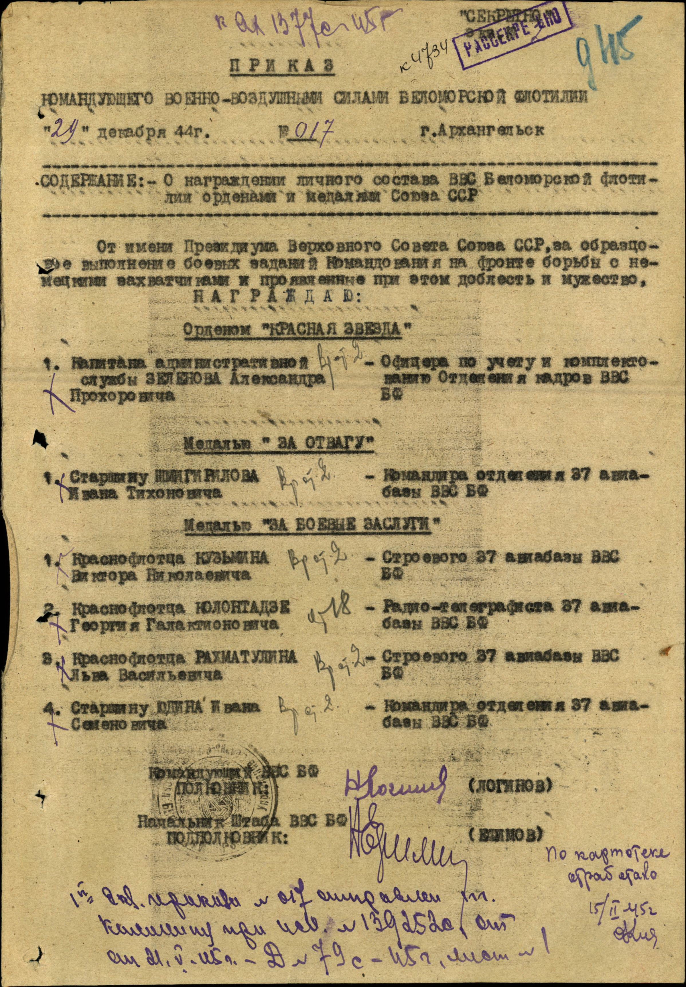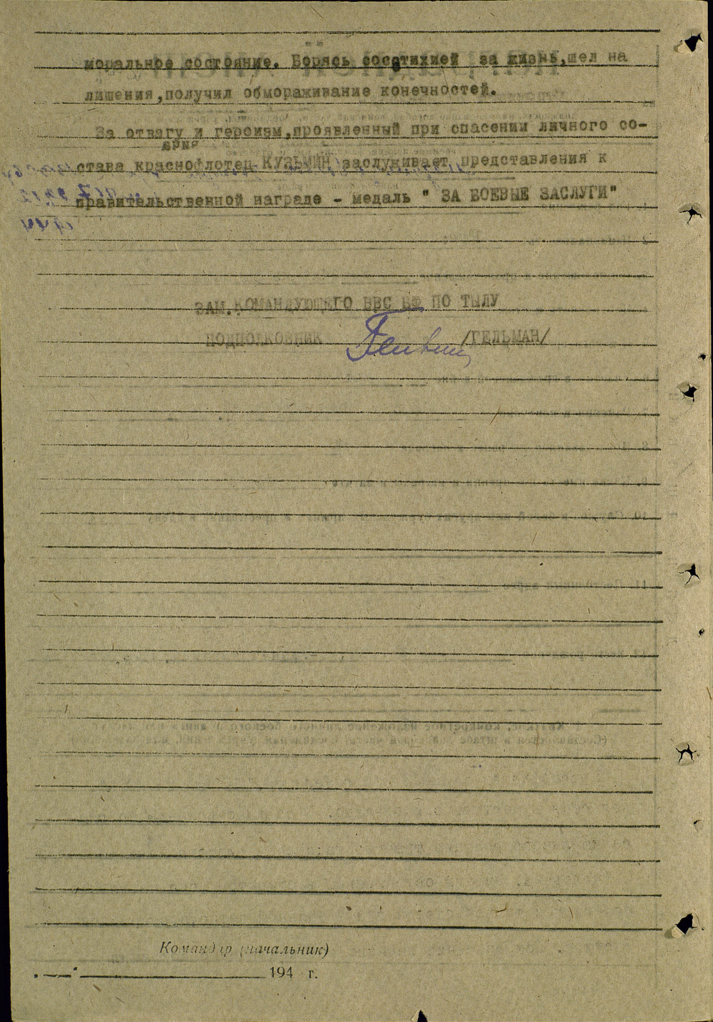 За отвагу и героизм, проявленные при спасении личного состава, краснофлотец Кузьмин заслуживает представления к правительственной награде – медали «За боевые заслуги».