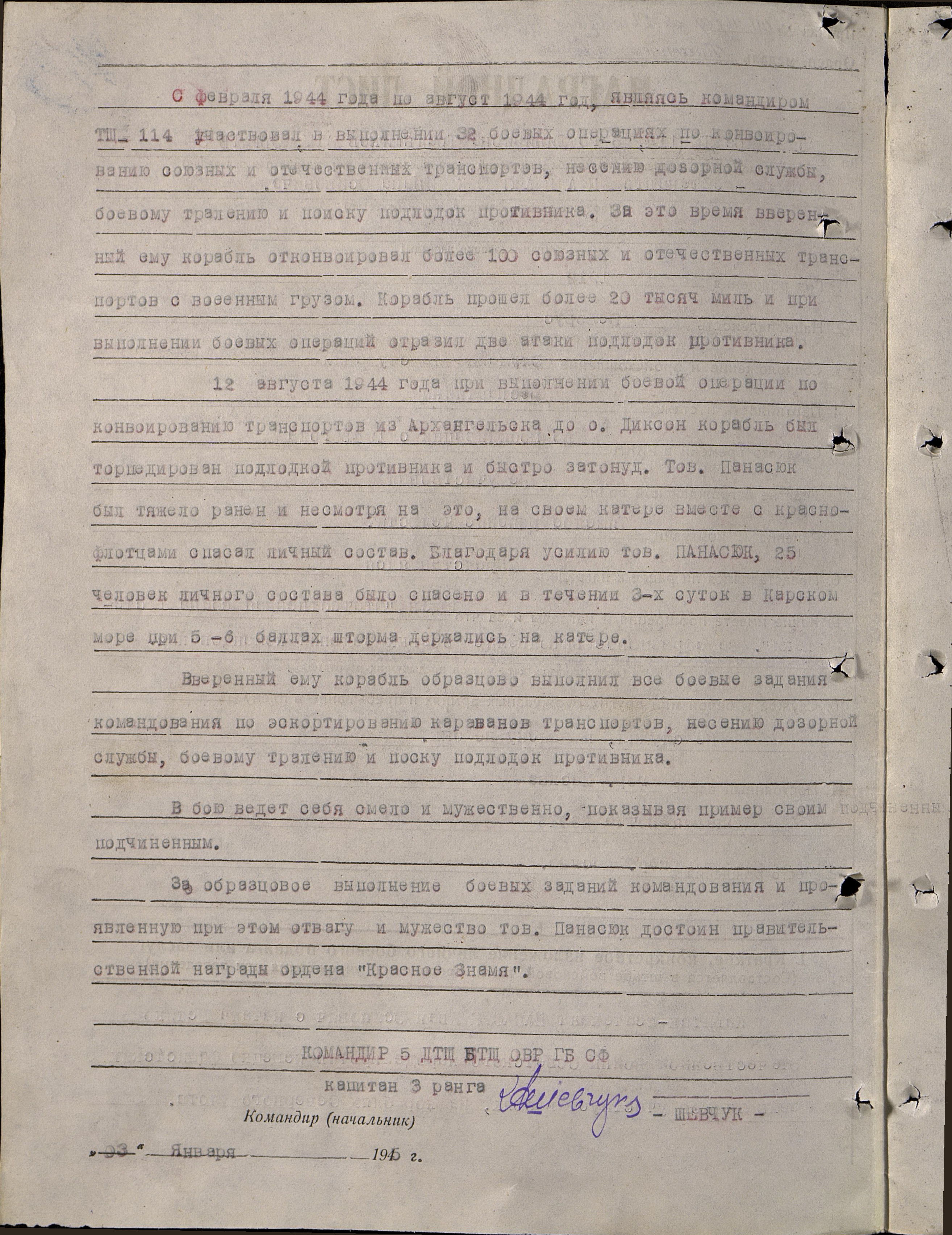 12 августа 1944 года при выполнении боевой операции по конвоированию транспортов (транспорта – С.Ш.) из Архангельска до о. Диксон корабль был торпедирован подлодкой противника и быстро затонул. Тов. Панасюк был тяжело ранен и, несмотря на это, на своем катере вместе с краснофлотцами спасал личный состав. Благодаря усилию тов. Панасюка 25 человек личного состава было спасено и в течение трех суток в Карском море при 5-6 баллах шторма держались на катере.
