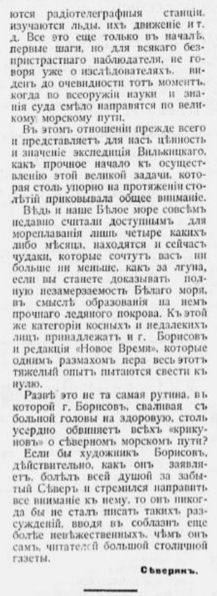 Через несколько дней в Поморскую губу зашел пароход «Пахтусов», на котором по любезному приглашению начальника экспедиции Северного Ледовитого океана А.И.Вилькицкого и командира корабля А.И.Варнека экспедиция А.А.Борисова добралась до Соловков, а оттуда на монастырском пароходе 5 сентября 1901 г. прибыла в Архангельск.