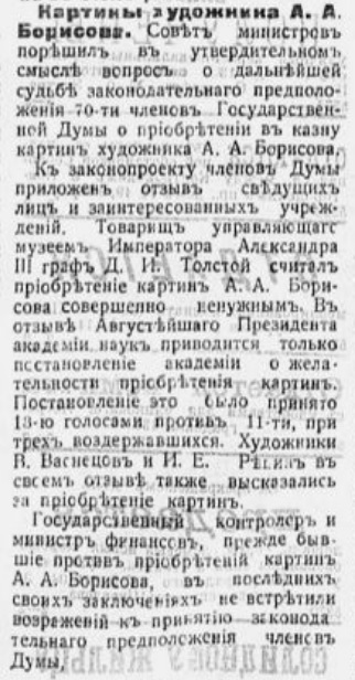 В 1888 г. поступает вольнослушателем в Академию художеств, в гипсовый класс. Его продолжают опекать А.А.Боголюбов и Б.А.Яловецкий. Но и появляются новые попечители – Илья Ильич Кази (1839-1896), директор Балтийского судостроительного завода, и Сергей Юльевич Витте (1849-1915), министр финансов России (с 1892 г.), а позднее – глава Российского правительства (до 1906 г.). Как выяснится позже, поддержка И.И.Кази творческой деятельности будущего художника во многом определит весь успех Борисова. По воспоминаниям С.Ю.Витте «[ ] за Борисова в академию художеств вскладчину платило несколько человек; Кази, между прочим, обыкновенно обращался ко мне для ежегодного за него взноса в академию художеств»[8]. Далее, в своих воспоминаниях С.Ю.Витте отмечает: «Я всегда несколько содействовал карьере Борисова; содействовал устройством выставок картин его как в Берлине, Лондоне, так и в Америке, так как в Америку он приехал через несколько лет после Портсмутского договора, когда еще мое имя пользовалось там большой популярностью, и так как я ему дал рекомендательное письмо к президенту Рузвельту, вследствие чего Рузвельт принял Борисова весьма радушно; это все послужило тому, что его выставки всюду имели блестящий успех»[9].