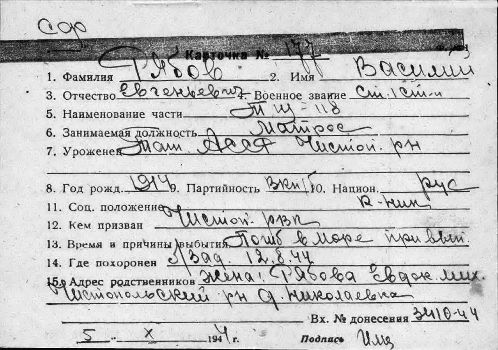 Донесение о безвозвратных потерях 3410 от 03.10.1944 (ЦВМА, Ф. 864, О. 1, Д. 1358).