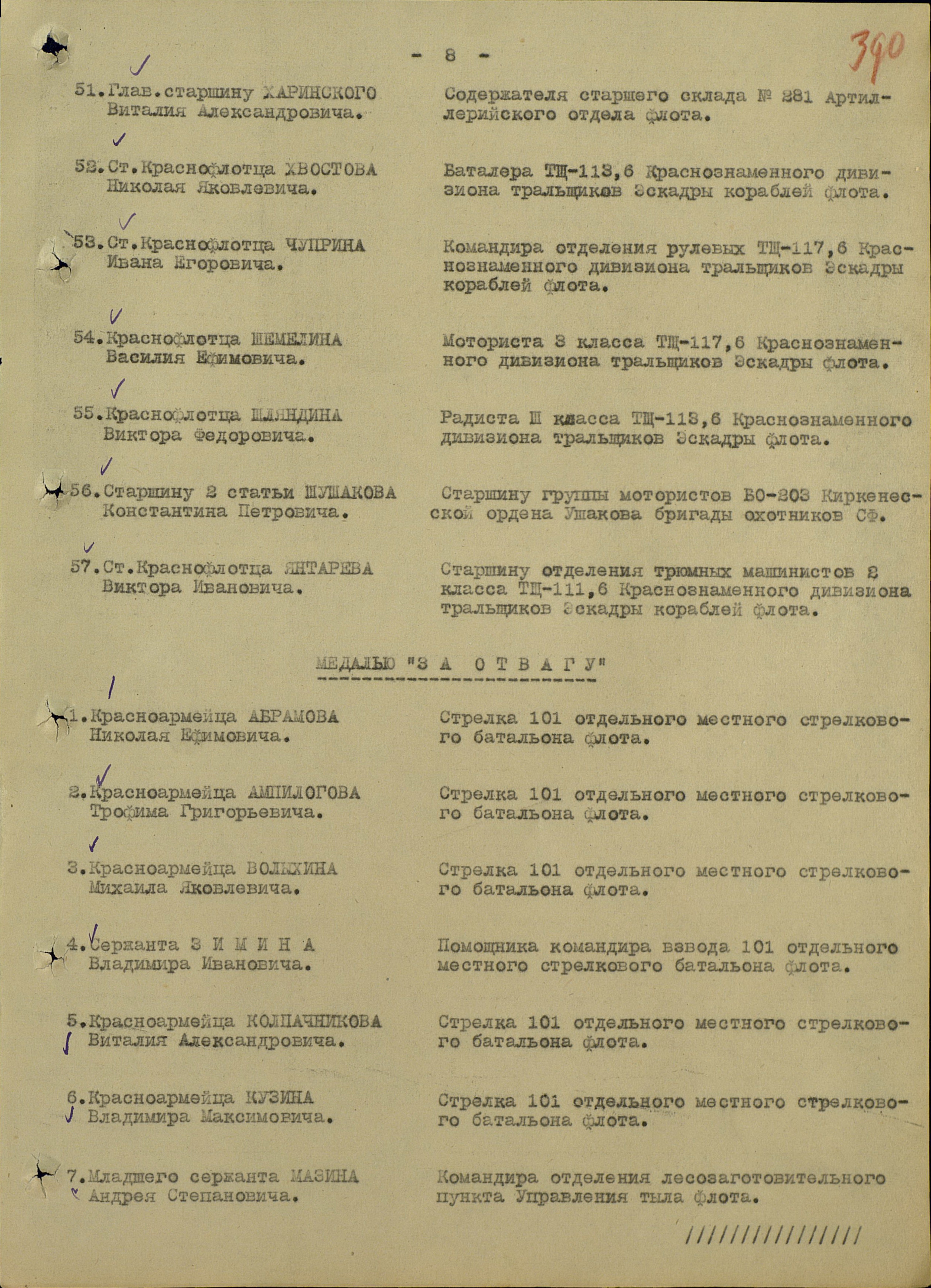 Краснофлотец Шемелин Василий Ефимович с 15 февраля 1945 г. по настоящее время участвует во всех боевых операциях, проводимых кораблем. За истекший период кораблем успешно выполнено 33 боевые операции по конвоированию кораблей и транспортов и тралению минных полей.