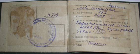 Аранин Лев Николаевич родился 5 марта 1912 г. на остр. Св Ольги в семье служащего (папа – Аранин Николай Дмитриевич, техник-строитель, мама – Аранина Ксения Федоровна, мещанка).