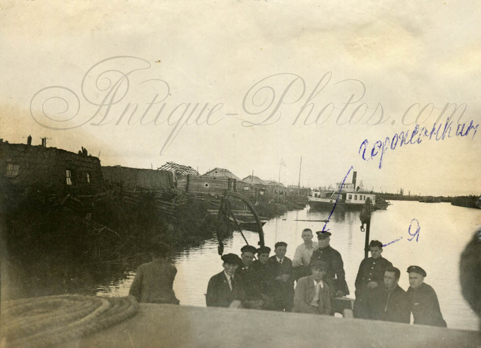 Фото № 41. "Река Индигирка, 2 августа 1942 г. Конец полевых работ. Затон Индигирского пароходства". Из современных пояснений хозяина альбома, безжалостно сделанных шариковой ручкой прямо на лицевой стороне фотографии, видно, где стоят заместитель начальника экспедиции М.Горожанкин и он сам (Дронников).