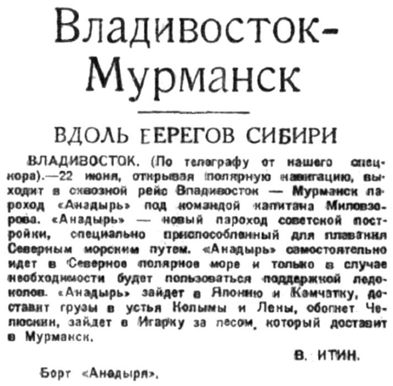 Сегодня, в 22 часа, над устьем Колымы, держа направление на Медвежьи острова, пролетел тов. Мопоков. «Анадырь» приветствовал героя Советского Союза длительными гудками.