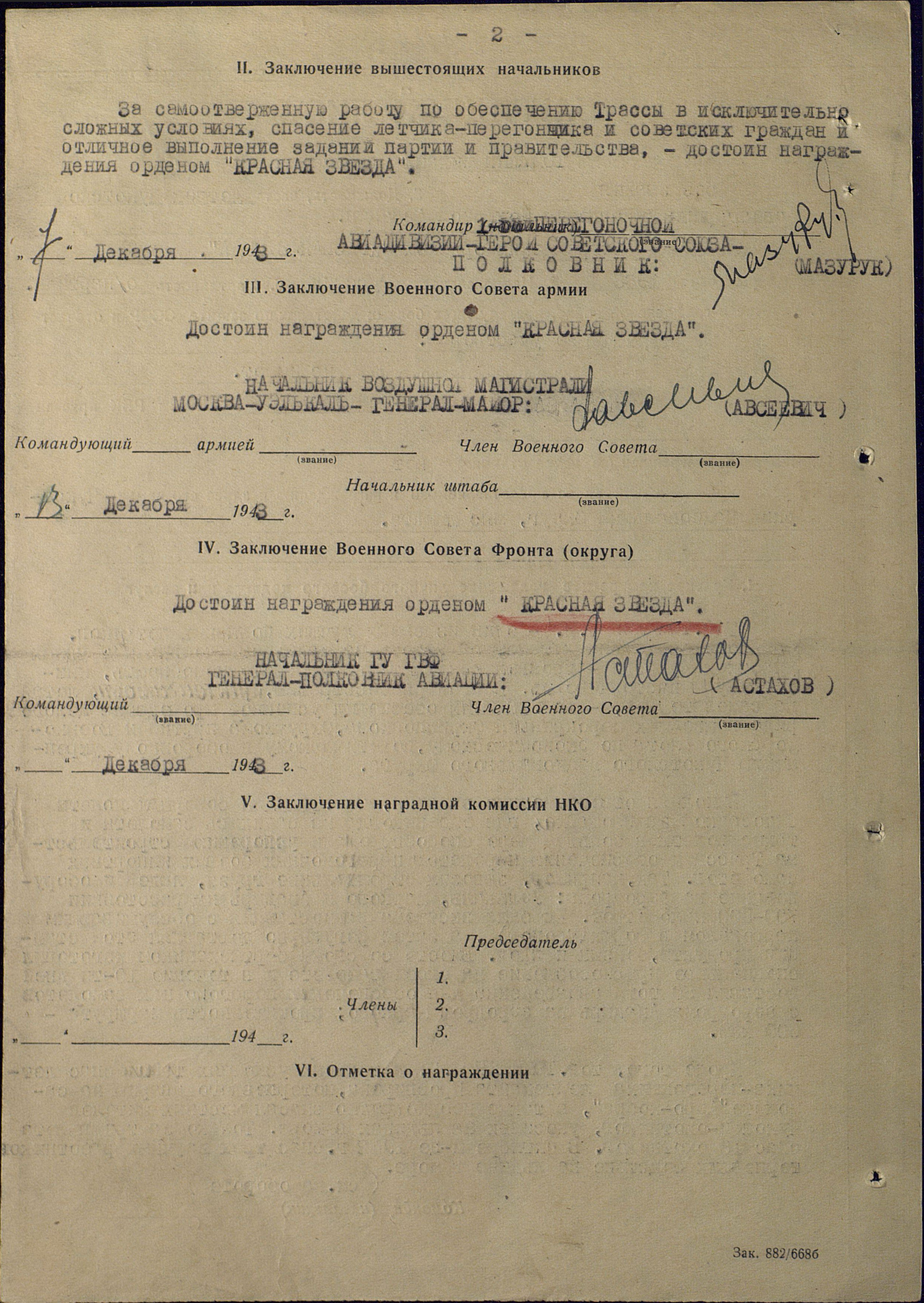 за самоотверженную работу по обеспечению трассы в исключительно сложных условиях, спасение летчика-перегонщика и советских граждан и отличное выполнение задании партии и правительства, - достоин награждения орденом "КРАСНАЯ ЗВЕЗДА".