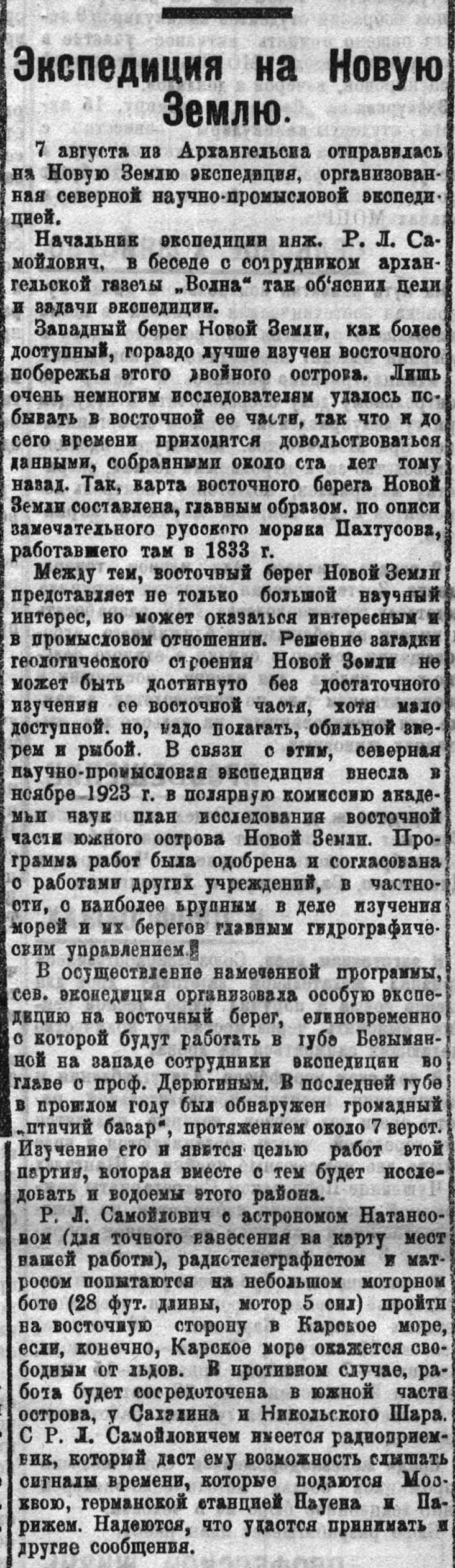Р. Л. Самойлович с астрономом Натансоном (для точного нанесения на карту мест нашей работы), радиотелеграфистом и матросом попытаются на небольшом моторном боте (28 фут. длины, мотор 5 сил) пройти на восточную сторону в Карское море, если, конечно, Карское море окажется свободным от льдов. В противном случае, работа будет сосредоточена в южной части острова, у Саханина и Никольскою Шара. С Р. Л. Самойловичем имеется радиоприемник, который даст ему возможность слышать сигналы времени, которые подаются Москвою, германской станцией Науена и Парижем. Надеются, что удастся принимать и другие сообщения.