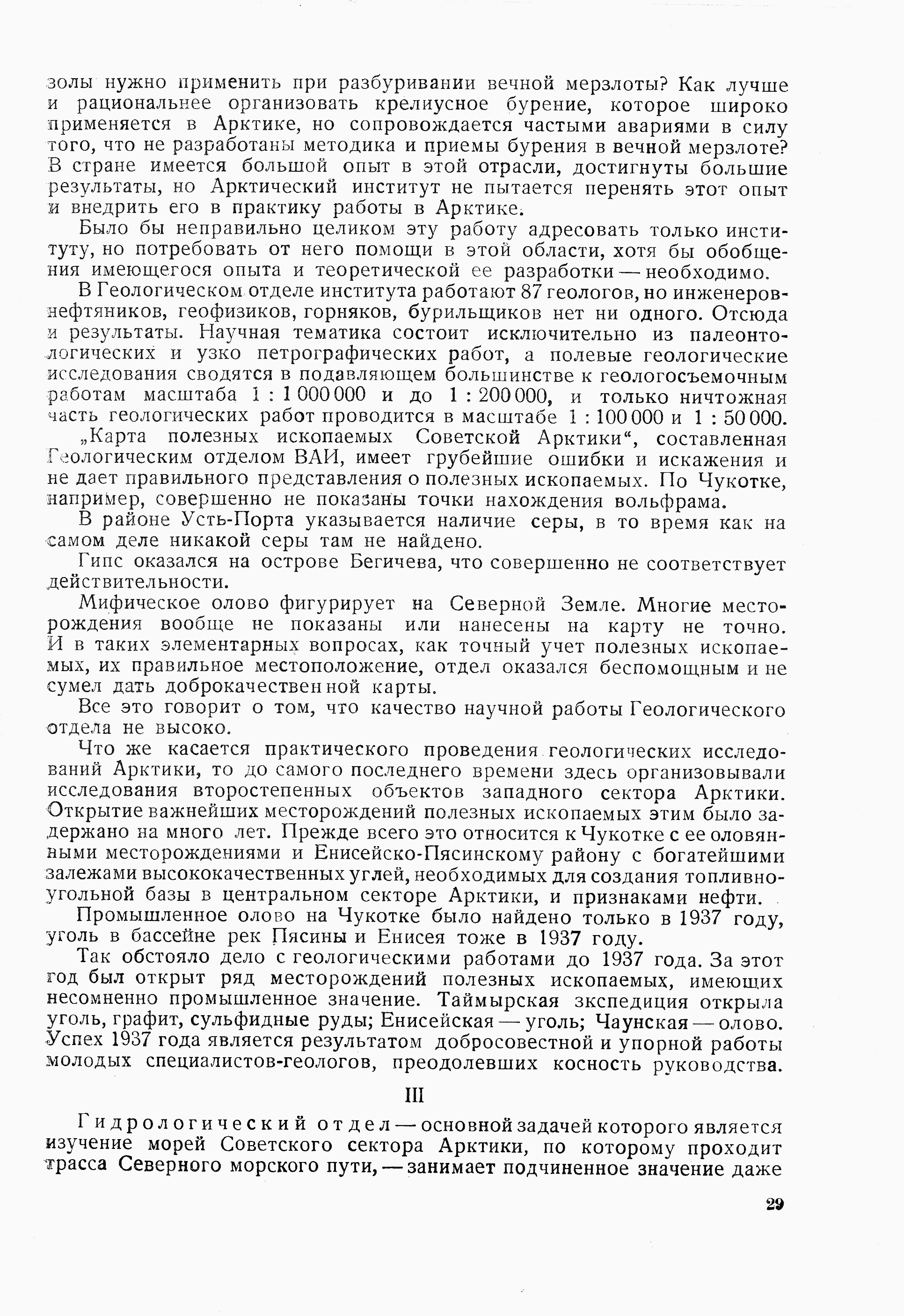 …Деятельностью [Геологического] отдела до 1936г. руководила группа геологов, которым были чужды интересы быстрейшего освоения месторождений полезных ископаемых Арктики. Вся их геологическая работа в Арктике сводилась к организации экскурсий туристского характера, сбору материалов для построений спекулятивного характера, для создания себе имени и авторитета «ученых». Эта группа пользовалась неограниченной поддержкой и защитой со стороны директора института Самойловича