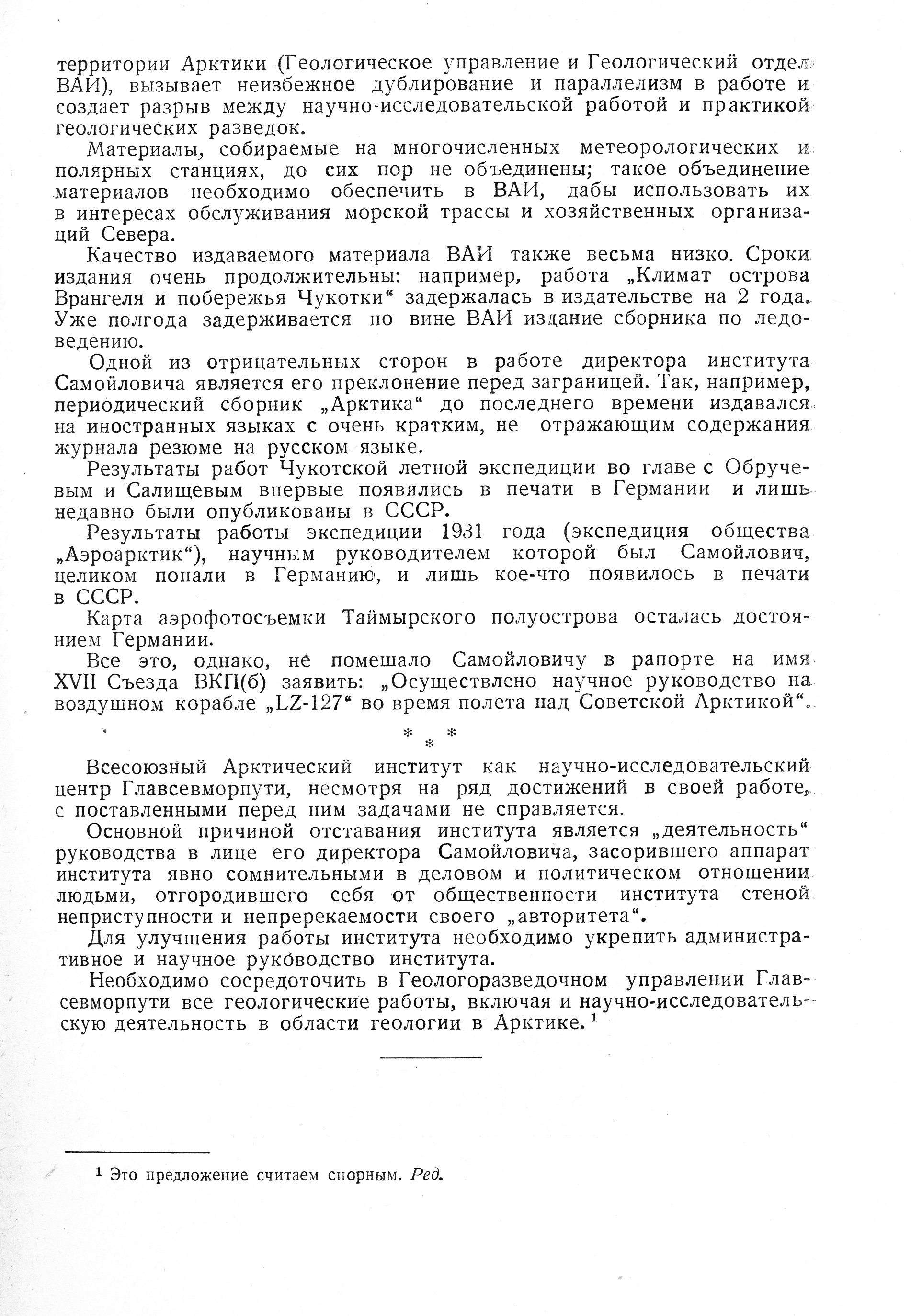 Думаю, не в этом дело. Статья, хоть и названа "О Всесоюзном Арктическом институте", направлена в первую очередь именно против Р. Л. Самойловича. Во-первых, ни разу не упомянута (и слава Богу) фамилия Визе - заместителя директора ИИС-ВАИ по научной работе, который непосредственно отвечал за научную программу института, подвергнутую столь разгромной критики. Во-вторых, авторы упоминают в негативном смысле экспедицию на "Графе Цеппелине", к которой ВАИ не имел никакого отношения, а Самойлович руководил ее научной частью. В подтверждение этих слов. В ЦГАНТД по СПб хранится документ (ф.369, оп.1-1, д.120) под названием "Отчет о работе Арктического Н.И. института за 15 лет (1920—1935)". На листах 10—28 приведен список всех экспедиций СНПЭ—ИИС—ВАИ с 1920 по 1935 год, причем упоминается, например, экспедиция по спасению "Италии" 1928 года, вообще-то организованная Осоавиахимом. Экспедиции на "Цеппелине" в этом списке нет.