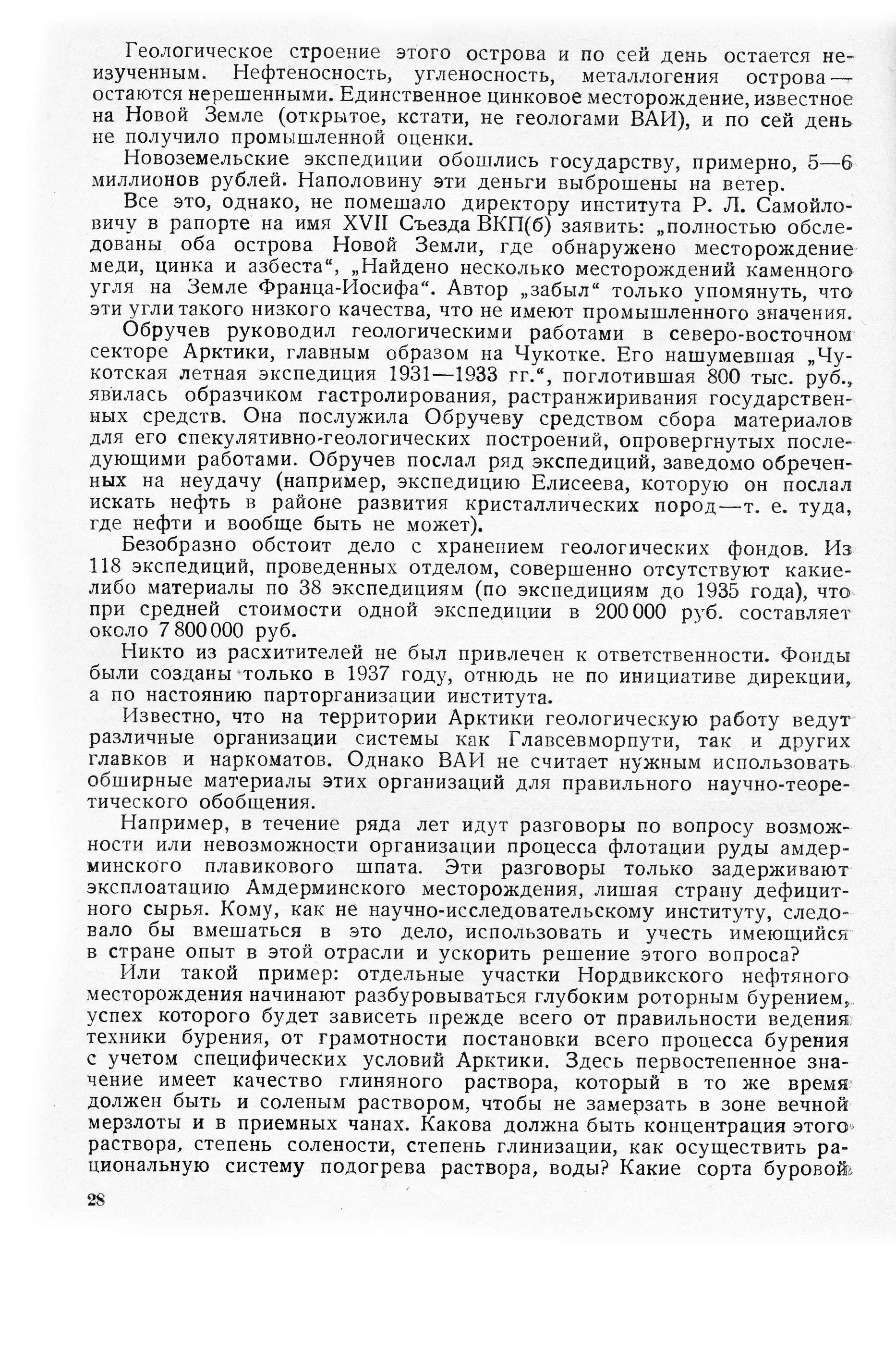 …Деятельностью [Геологического] отдела до 1936г. руководила группа геологов, которым были чужды интересы быстрейшего освоения месторождений полезных ископаемых Арктики. Вся их геологическая работа в Арктике сводилась к организации экскурсий туристского характера, сбору материалов для построений спекулятивного характера, для создания себе имени и авторитета «ученых». Эта группа пользовалась неограниченной поддержкой и защитой со стороны директора института Самойловича