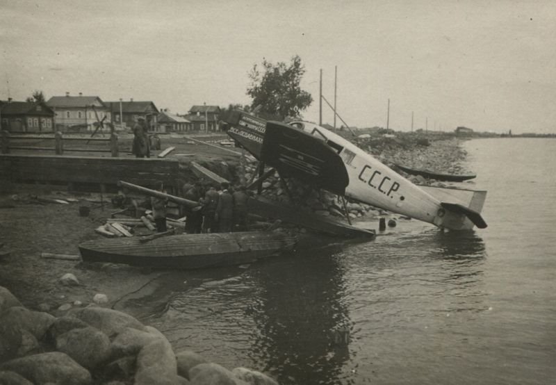 В фондах Белозерского музея хранится коллекция фотографий самодеятельного фотографа г. Белозерска Василия Васильевича Кичагова. Он оставил нам замечательную фотохронику Белозерья 1920 — 1930-х гг. В условиях дефицита фотобумаги, пленки, кризиса, который переживало фотодело в СССР, В.В. Кичагов сумел отразить жизнь города во всех ее проявлениях. Среди прочих в его коллекции находим фотографии с изображением гидросамолета, который в сентябре 1928 года приземлился на Белое озеро в районе города Белозерска. На борту самолета крупным текстом надпись: «Агитсамолет ОСОАВИАХИМА СССР — все в ОСОАВИАХИМ». Для населения города это было событие. Судя по датам, указанным на фотографиях, самолет в течение четырех дней с 12 по 15 сентября находился в Белозерске. При приземлении самолет врезался в берег, один из поплавков слетел со стоек шасси. На фотографии мы видим, как группа мужчин старается приподнять корпус самолета, чтобы закрепить слетевший поплавок. Все, от мала до велика, шли на озеро, чтобы посмотреть на чудо техники. По рассказам очевидцев, желающих-смельчаков на самолете катали над озером. Это была своего рода наглядная агитация.