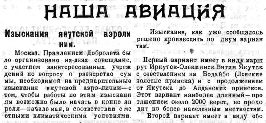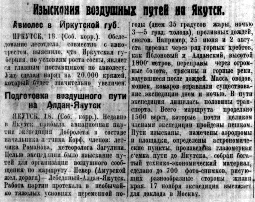 7. Докладная записка исследователя трассы для воздушной линии Алдан-Якутск в правление общества «Добролет». (Подробное описание поисков трассы - художественное описание Якутии, перспективы авиастроительства, описание аэродрома Незаметный). Подлинник. август - сентябрь 1925 г. ф. 9577, оп. 1, д. 89, лл. 42 - 47об.