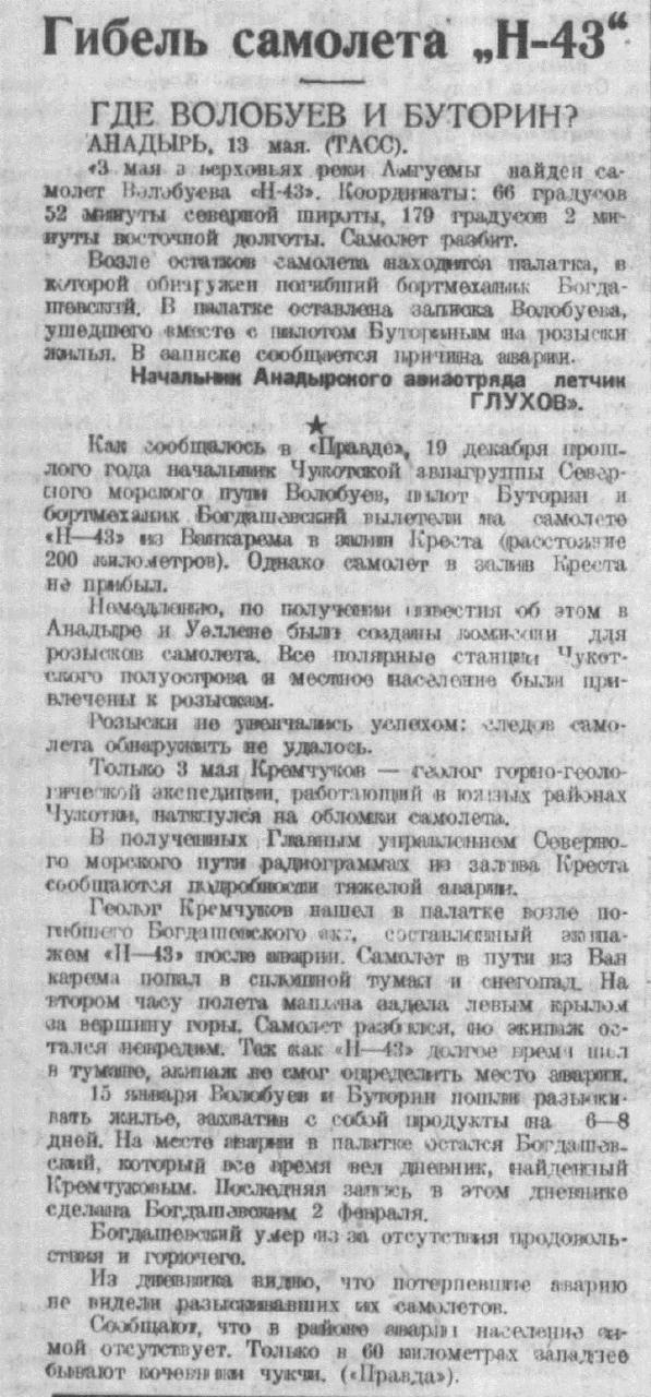 Геолог Кремчуков нашел 3 мая в верховьях р. Амгуемы разбитый самолет "Н-43". 1) Недалеко от этого места он обнаружил палатку, а в ней труп бортмеханика т. Богдашевского, там же Кремчуков нашел записку Волобуева, сообщавшую, что 15 января он ушел вместе с пилотом Буториным на розыски жилья, и акт экипажа о причинах аварии самолета.