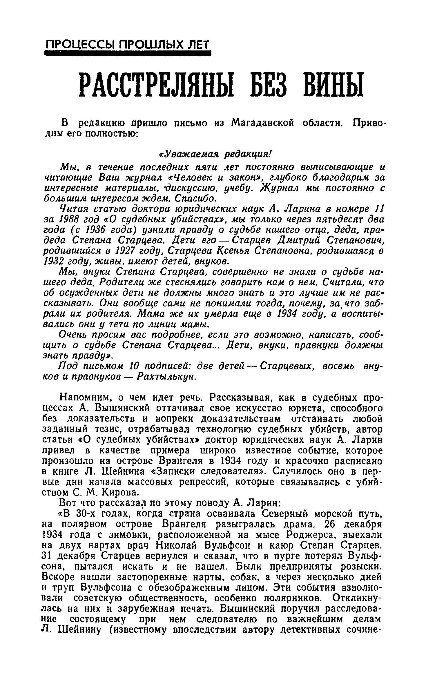 Читая статью доктора юридических наук А. Ларина в номере 11 за 1988 год «О судебных убийствах», мы только через пятьдесят два года (с 1936 года) узнали правду о судьбе нашего отца, деда, прадеда Степана Старцева. Дети его — Старцев Дмитрий Степанович, родившийся в 1927 году, Старцева Ксенья Степановна, родившаяся в 1932 году, живы, имеют детей, внуков.