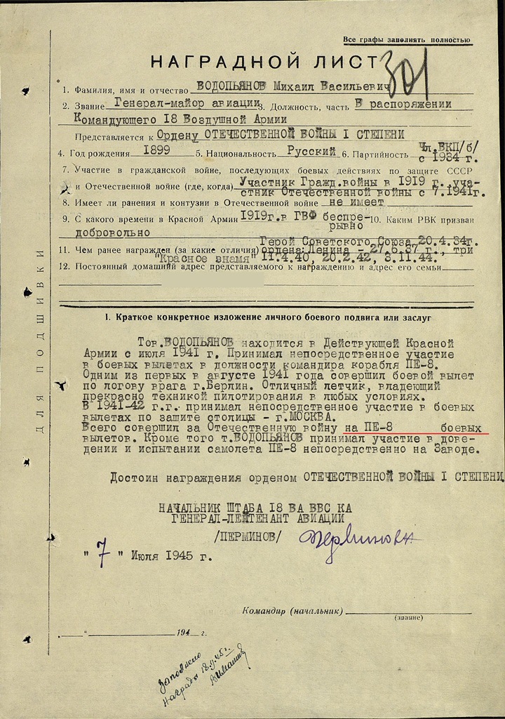 Ув.форумчанин Bills Bons, как я уже отмечал, с биографией М.В.Водопьянова проблем нет, есть его личное дело. А вот нет цифр по боевому налёту в 1941-1945 гг. В этом и вопрос... :)