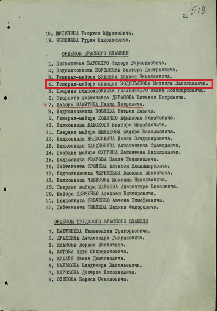 Две новости - на 13.07.1945 г. М.В.Водопьянов имел звание ГВАРДИИ г/м-ра авиации и, будучи откомандированным в распоряжение А.Е.Голованова, стоял на должности командира корабля в том же полку - 25-м Орловском гтбап (до 18.09.1943 г. - 746-й ап дд) 11-й гбад ( до 26.03.1943 г.- 3-я ад дд, до 26.12.1944 г. - 1-я гад дд) 18-й ВА.