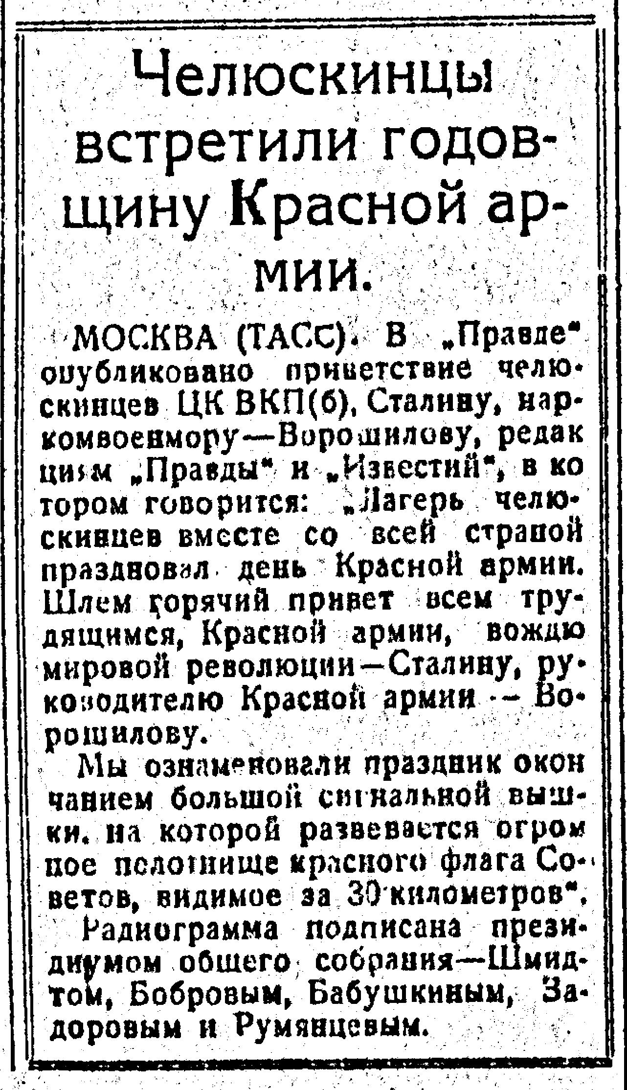 МОСКВА (ТАСС). В „Правде" опубликовано приветствие челюскинцев ЦК ВКП (б), Сталину, наркомвоенмору — Ворошилову, редакции „Правды" и „Известий", в котором говорится: "Лагерь челюскинцев вместе со всей страной праздновал день Красной армии. Шлем горячий привет всем трудящимся, Красной армии, вождю мировой революции—Сталину, руководителю Красной армии - Ворошилову.